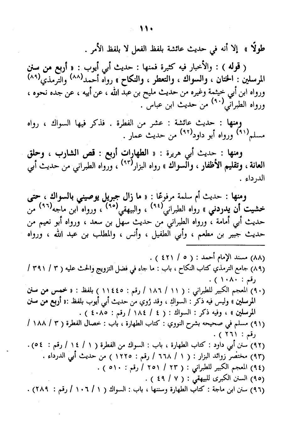وَمِنْهَا: حَدِيثُ أَبِي هُرَيْرَةَ: «الطَّهَارَاتُ أَرْبَعٌ: قَصُّ الشَّارِبِ، وَحَلْقُ الْعَانَةِ، وَتَقْلِيمُ الْأَظْفَارِ، وَالسِّوَاكُ» رَوَاهُ الْبَزَّارُ، وَرَوَاهُ الطَّبَرَانِيُّ مِنْ حَدِيثِ أَبِي الدَّرْدَاءِ.