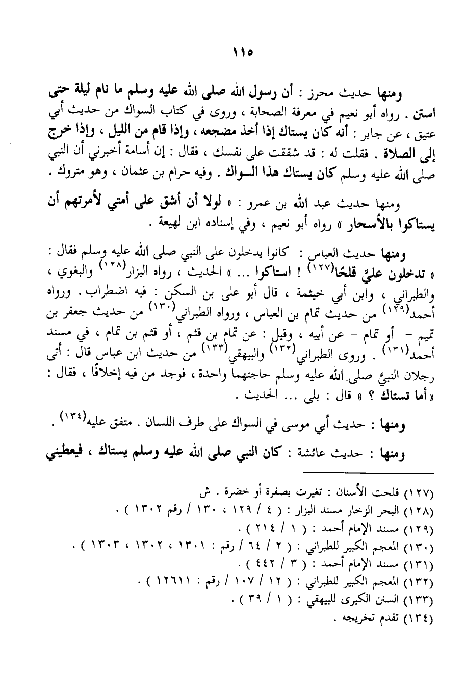 وَمِنْهَا حَدِيثُ الْعَبَّاسِ: «كَانُوا يَدْخُلُونَ عَلَى النَّبِيِّ - صَلَّى اللَّهُ عَلَيْهِ وَسَلَّمَ - فَقَالَ: تَدْخُلُونَ عَلَيَّ قُلْحًا، اسْتَاكُوا.» الْحَدِيثَ، رَوَاهُ الْبَزَّارُ وَالْبَغَوِيُّ، وَالطَّبَرَانِيُّ، وَابْنُ أَبِي خَيْثَمَةَ، قَالَ أَبُو عَلِيِّ بْنُ السَّكَنِ: فِيهِ اضْطِرَابٌ. وَرَوَاهُ أَحْمَدُ مِنْ حَدِيثِ تَمَّامِ بْنِ الْعَبَّاسِ، وَرَوَاهُ الطَّبَرَانِيُّ مِنْ حَدِيثِ جَعْفَرِ بْنِ تَمِيمٍ - أَوْ تَمَّامٍ - عَنْ أَبِيهِ، وَقِيلَ: عَنْ تَمَّامِ بْنِ قُثَمَ، أَوْ ابْنِ تَمَّامٍ، فِي مُسْنَدِ أَحْمَدَ.