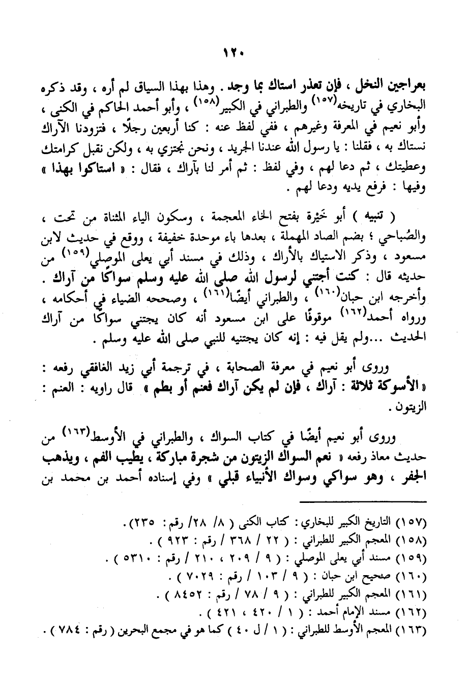 وَرَوَى أَبُو نُعَيْمٍ فِي مَعْرِفَة الصَّحَابَةِ، فِي تَرْجَمَةِ أَبِي زَيْدٍ الْغَافِقِيِّ رَفَعَهُ: «الْأَسْوِكَةُ ثَلَاثَةٌ: أَرَاكٌ، فَإِنْ لَمْ يَكُنْ أَرَاكٌ فَعَنَمٌ أَوْ بُطْمٌ» قَالَ رَاوِيهِ: الْعَنَمُ الزَّيْتُونُ.