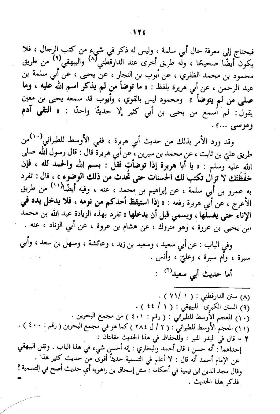 وَفِيهِ أَيْضًا مِنْ طَرِيقِ الْأَعْرَجِ، عَنْ أَبِي هُرَيْرَةَ رَفَعَهُ: «إذَا اسْتَيْقَظَ أَحَدُكُمْ مِنْ نَوْمِهِ، فَلَا يُدْخِلْ يَدَهُ فِي الْإِنَاءِ حَتَّى يَغْسِلَهَا وَيُسَمِّيَ قَبْلَ أَنْ يُدْخِلَهَا» تَفَرَّدَ بِهَذِهِ الزِّيَادَةِ عَبْدُ اللَّهِ بْنُ مُحَمَّدِ بْنِ يَحْيَى بْنِ عُرْوَةَ، وَهُوَ مَتْرُوكٌ، عَنْ هِشَامِ بْنِ عُرْوَةَ، عَنْ أَبِي الزِّنَادِ، عَنْهُ. وَفِي الْبَابِ: عَنْ أَبِي سَعِيدٍ، وَسَعِيدِ بْنِ زَيْدٍ، وَعَائِشَةَ، وَسَهْلِ بْنِ سَعْدٍ، وَأَبِي سَبْرَةَ، وَأُمِّ سَبْرَةَ، وَعَلِيٍّ، وَأَنَسٍ. أَمَّا حَدِيثُ أَبِي سَعِيدٍ: