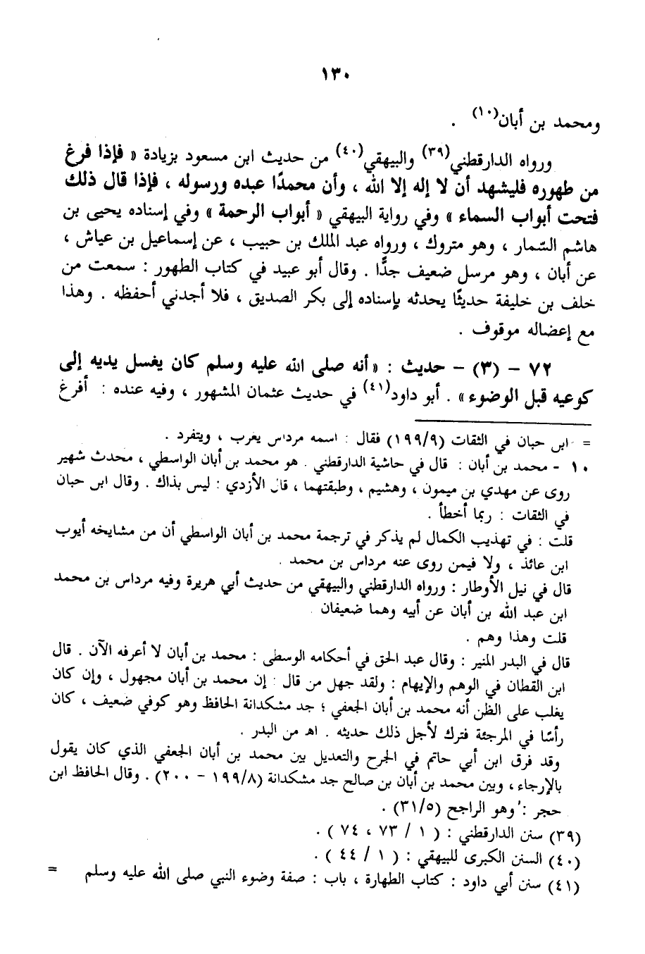 وَمُحَمَّدُ بْنُ أَبَانَ. وَرَوَاهُ الدَّارَقُطْنِيُّ وَالْبَيْهَقِيُّ مِنْ حَدِيثِ ابْنِ مَسْعُودٍ بِزِيَادَةِ «فَإِذَا فَرَغَ مِنْ طَهُورِهِ فَلْيَشْهَدْ أَنْ لَا إلَهَ إلَّا اللَّهُ، وَأَنَّ مُحَمَّدًا عَبْدُهُ وَرَسُولُهُ، فَإِذَا قَالَ ذَلِكَ فُتِحَتْ أَبْوَابُ السَّمَاءِ» وَفِي رِوَايَةِ الْبَيْهَقِيّ «أَبْوَابُ الرَّحْمَةِ» وَفِي إسْنَادِهِ يَحْيَى بْنُ هَاشِمٍ السَّمَّارُ، وَهُوَ مَتْرُوكٌ.