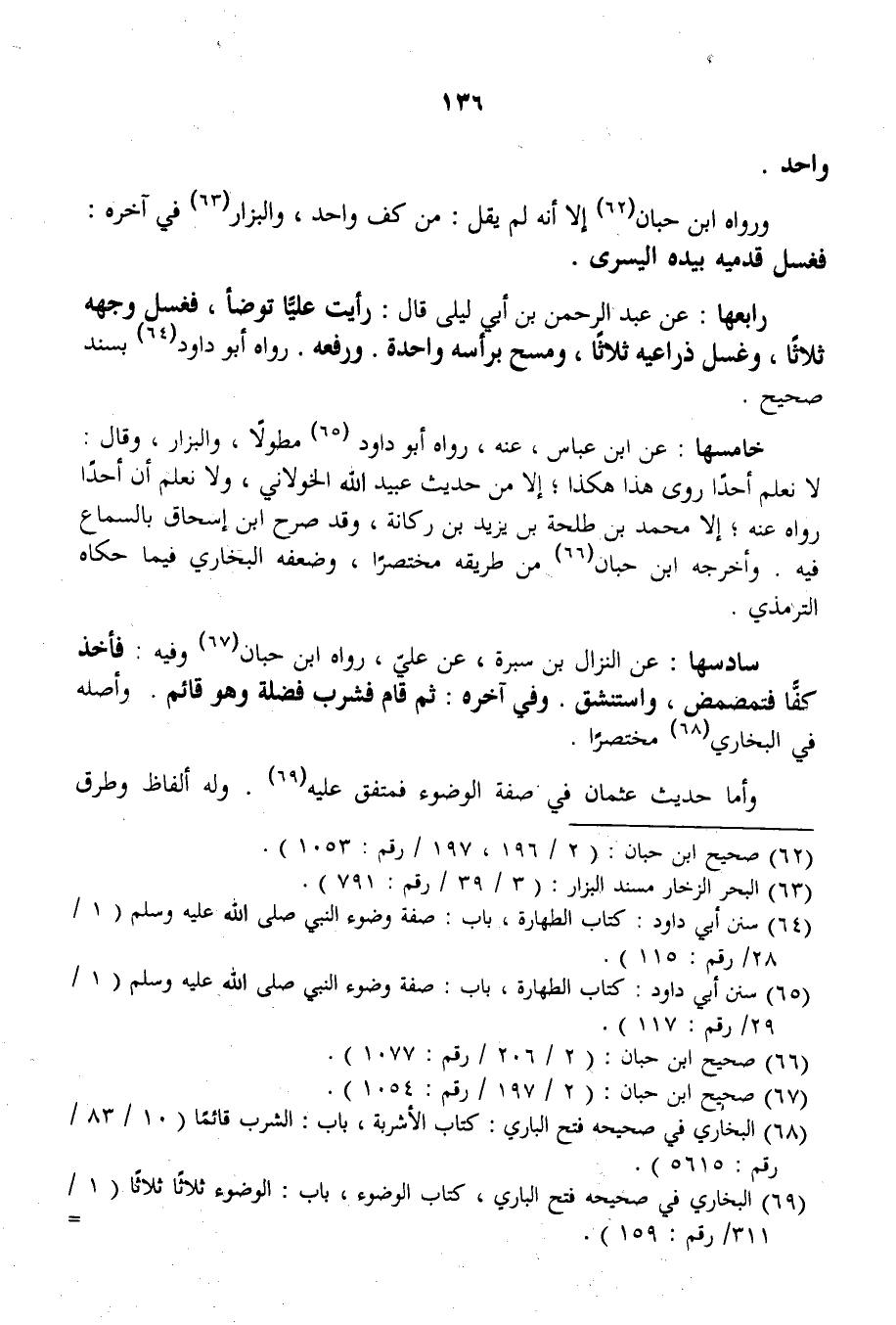 وَرَوَاهُ ابْنِ حِبَّانَ إلَّا أَنَّهُ لَمْ يَقُلْ: مِنْ كَفٍّ وَاحِدٍ، وَالْبَزَّارُ فِي آخِرِهِ: فَغَسَلَ قَدَمَيْهِ بِيَدِهِ الْيُسْرَى. رَابِعُهَا: عَنْ عَبْدِ الرَّحْمَنِ بْنِ أَبِي لَيْلَى قَالَ: رَأَيْت عَلِيًّا تَوَضَّأَ، فَغَسَلَ وَجْهَهُ ثَلَاثًا، وَغَسَلَ ذِرَاعَيْهِ ثَلَاثًا، وَمَسَحَ بِرَأْسِهِ وَاحِدَةً. وَرَفَعَهُ. رَوَاهُ أَبُو دَاوُد بِسَنَدٍ صَحِيحٍ. خَامِسُهَا: عَنْ ابْنِ عَبَّاسٍ، عَنْهُ، رَوَاهُ أَبُو دَاوُد مُطَوَّلًا، وَالْبَزَّارُ، وَقَالَ: لَا نَعْلَمُ أَحَدًا رَوَى هَذَا هَكَذَا؛ إلَّا مِنْ حَدِيثِ عُبَيْدِ اللَّهِ الْخَوْلَانِيِّ، وَلَا نَعْلَمُ أَنَّ أَحَدًا رَوَاهُ عَنْهُ إلَّا مُحَمَّدَ بْنَ طَلْحَةَ بْنِ يَزِيدَ بْنِ رُكَانَةَ، وَقَدْ صَرَّحَ ابْنُ إِسْحَاقَ بِالسَّمَاعِ فِيهِ.