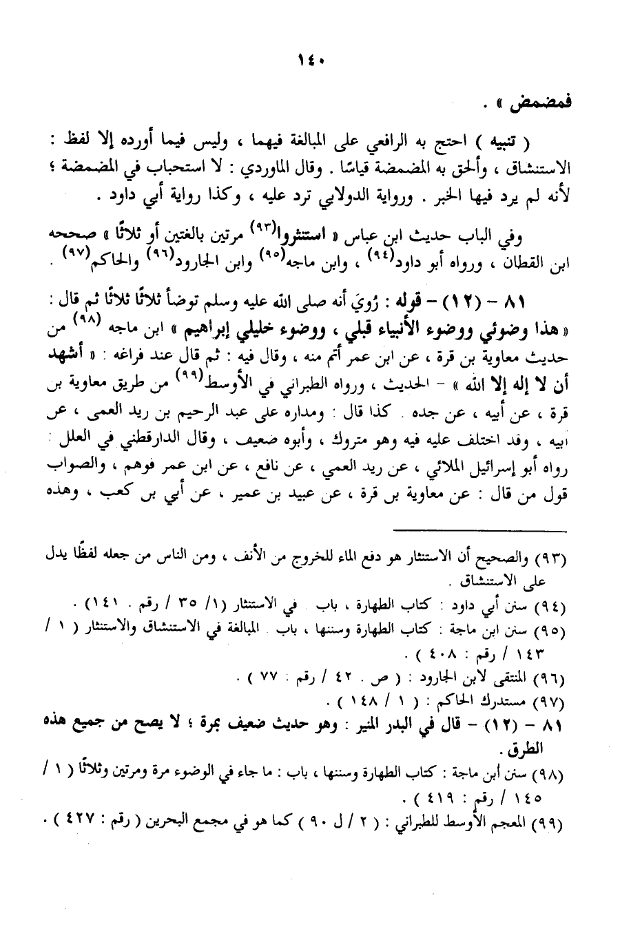 81 - (12) - قَوْلُهُ: رُوِيَ «أَنَّهُ - صَلَّى اللَّهُ عَلَيْهِ وَسَلَّمَ - تَوَضَّأَ ثَلَاثًا ثَلَاثًا ثُمَّ قَالَ: هَذَا وُضُوئِي وَوُضُوءُ الْأَنْبِيَاءِ قَبْلِي، وَوُضُوءُ خَلِيلِي إبْرَاهِيمَ» ابْنُ مَاجَهْ مِنْ حَدِيثِ مُعَاوِيَةَ بْنِ قُرَّةَ، عَنْ ابْنِ عُمَرَ أَتَمَّ مِنْهُ، وَقَالَ فِيهِ: «ثُمَّ قَالَ عِنْدَ فَرَاغِهِ أَشْهَدُ أَنْ لَا إلَهَ إلَّا اللَّهُ» - الْحَدِيثَ، وَرَوَاهُ الطَّبَرَانِيُّ فِي الْأَوْسَطِ مِنْ طَرِيقِ مُعَاوِيَةَ بْنِ قُرَّةَ، عَنْ أَبِيهِ، عَنْ جَدِّهِ كَذَا قَالَ وَمَدَارُهُ عَلَى عَبْدِ الرَّحِيمِ بْنِ زَيْدِ الْعَمِّيِّ، عَنْ أَبِيهِ. وَقَدْ اُخْتُلِفَ عَلَيْهِ فِيهِ وَهُوَ مَتْرُوكٌ، وَأَبُوهُ ضَعِيفٌ، وَقَالَ الدَّارَقُطْنِيُّ فِي الْعِلَلِ رَوَاهُ أَبُو إسْرَائِيلَ الْمُلَائِيُّ، عَنْ زَيْدٍ الْعَمِّيِّ، عَنْ نَافِعٍ، عَنْ ابْنِ عُمَرَ فَوَهِمَ، وَالصَّوَابُ قَوْلُ مَنْ قَالَ: عَنْ مُعَاوِيَةَ بْنِ قُرَّةَ، عَنْ عُبَيْدِ بْنِ عُمَيْرٍ، عَنْ أُبَيَّ بْنِ كَعْبٍ، وَهَذِهِ