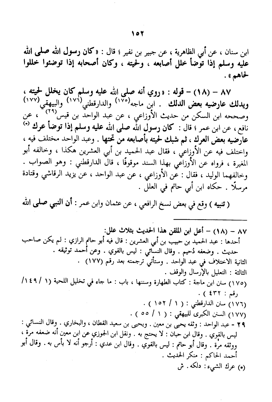 87 - (18) - قَوْلُهُ: " رُوِيَ «أَنَّهُ - صَلَّى اللَّهُ عَلَيْهِ وَسَلَّمَ - كَانَ يُخَلِّلُ لِحْيَتَهُ، وَيُدَلِّكُ عَارِضَيْهِ بَعْضَ الدَّلْكِ» . ابْنُ مَاجَهْ وَالدَّارَقُطْنِيّ وَالْبَيْهَقِيُّ وَصَحَّحَهُ ابْنُ السَّكَنِ مِنْ حَدِيثِ الْأَوْزَاعِيِّ، عَنْ عَبْدِ الْوَاحِدِ بْنِ قَيْسٍ، عَنْ نَافِعٍ، عَنْ ابْنِ عُمَرَ؛ قَالَ: «كَانَ رَسُولُ اللَّهِ - صَلَّى اللَّهُ عَلَيْهِ وَسَلَّمَ - إذَا تَوَضَّأَ عَرَكَ عَارِضَيْهِ بَعْضَ الْعَرْكِ، ثُمَّ شَبَكَ لِحْيَتَهُ بِأَصَابِعِهِ مِنْ تَحْتِهَا» . وَعَبْدُ الْوَاحِدِ مُخْتَلَفٌ فِيهِ، وَاخْتُلِفَ فِيهِ عَنْ الْأَوْزَاعِيِّ، فَقَالَ عَبْدُ الْحَمِيدِ بْنُ أَبِي الْعِشْرِينَ هَكَذَا، وَخَالَفَهُ أَبُو الْمُغِيرَةِ، فَرَوَاهُ عَنْ الْأَوْزَاعِيِّ بِهَذَا السَّنَدِ مَوْقُوفًا، قَالَ الدَّارَقُطْنِيُّ: وَهُوَ الصَّوَابُ. وَخَالَفَهُمَا الْوَلِيدُ، فَقَالَ: عَنْ الْأَوْزَاعِيِّ، عَنْ عَبْدِ الْوَاحِدِ، عَنْ يَزِيدَ الرَّقَاشِيِّ وَقَتَادَةَ مُرْسَلًا. حَكَاهُ ابْنُ أَبِي حَاتِمٍ فِي الْعِلَلِ.