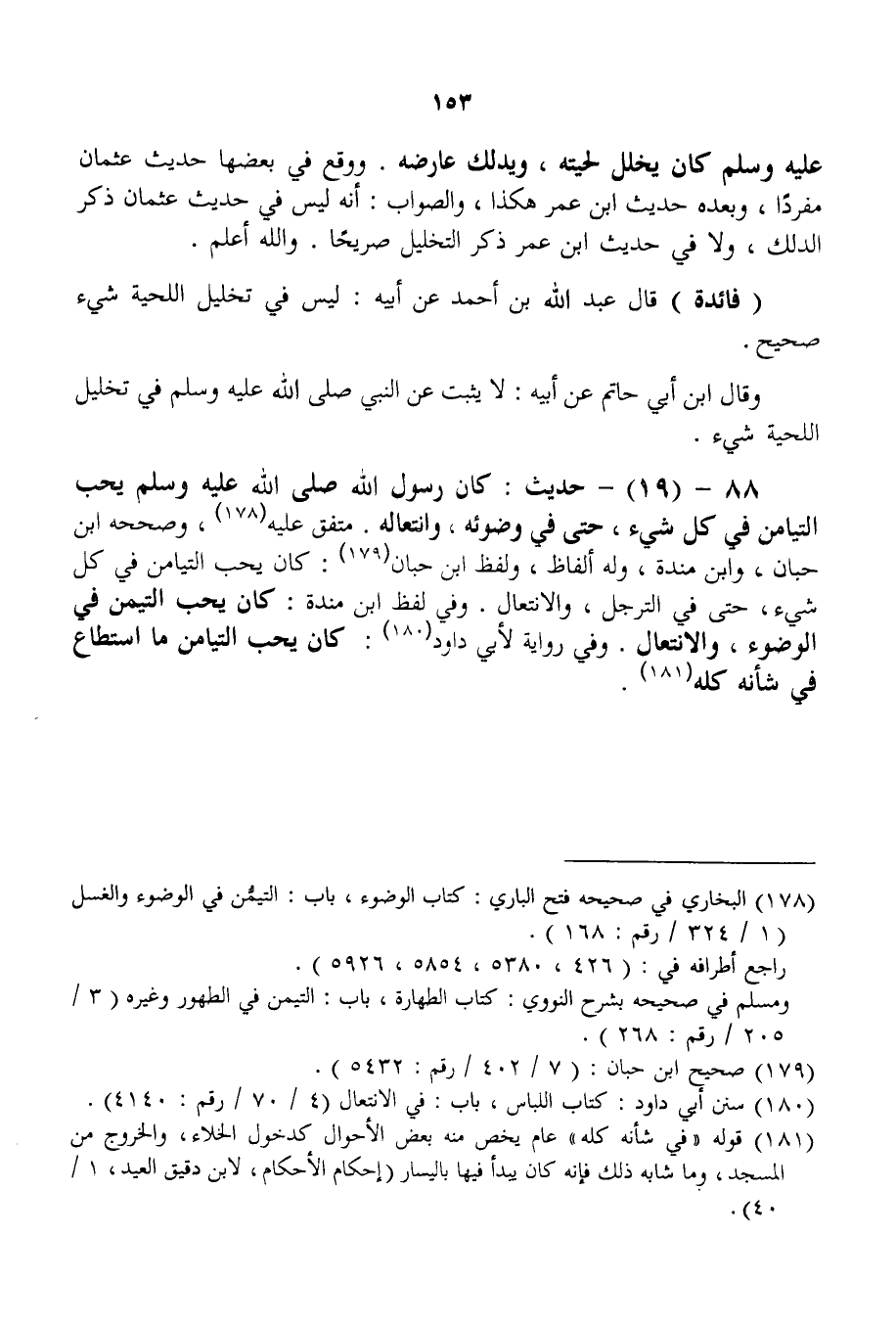 كَانَ يُخَلِّلُ لِحْيَتَهُ، وَيُدَلِّكُ عَارِضَهُ» . وَوَقَعَ فِي بَعْضهَا حَدِيثُ عُثْمَانَ مُفْرَدًا، وَبَعْدَهُ حَدِيثُ ابْنِ عُمَرَ هَكَذَا، وَالصَّوَابُ: أَنَّهُ لَيْسَ فِي حَدِيثِ عُثْمَانَ ذِكْرُ الدَّلْكِ، وَلَا فِي حَدِيثِ ابْنِ عُمَرَ ذَكَرَ التَّخْلِيلَ صَرِيحًا. وَاَللَّهُ أَعْلَمُ. (فَائِدَة) قَالَ عَبْدُ اللَّهِ بْنُ أَحْمَدَ عَنْ أَبِيهِ: لَيْسَ فِي تَخْلِيلِ اللِّحْيَةِ شَيْءٌ صَحِيحٌ. وَقَالَ ابْنُ أَبِي حَاتِمٍ عَنْ أَبِيهِ: لَا يَثْبُتُ عَنْ النَّبِيِّ - صَلَّى اللَّهُ عَلَيْهِ وَسَلَّمَ - فِي تَخْلِيلِ اللِّحْيَةِ شَيْءٌ.