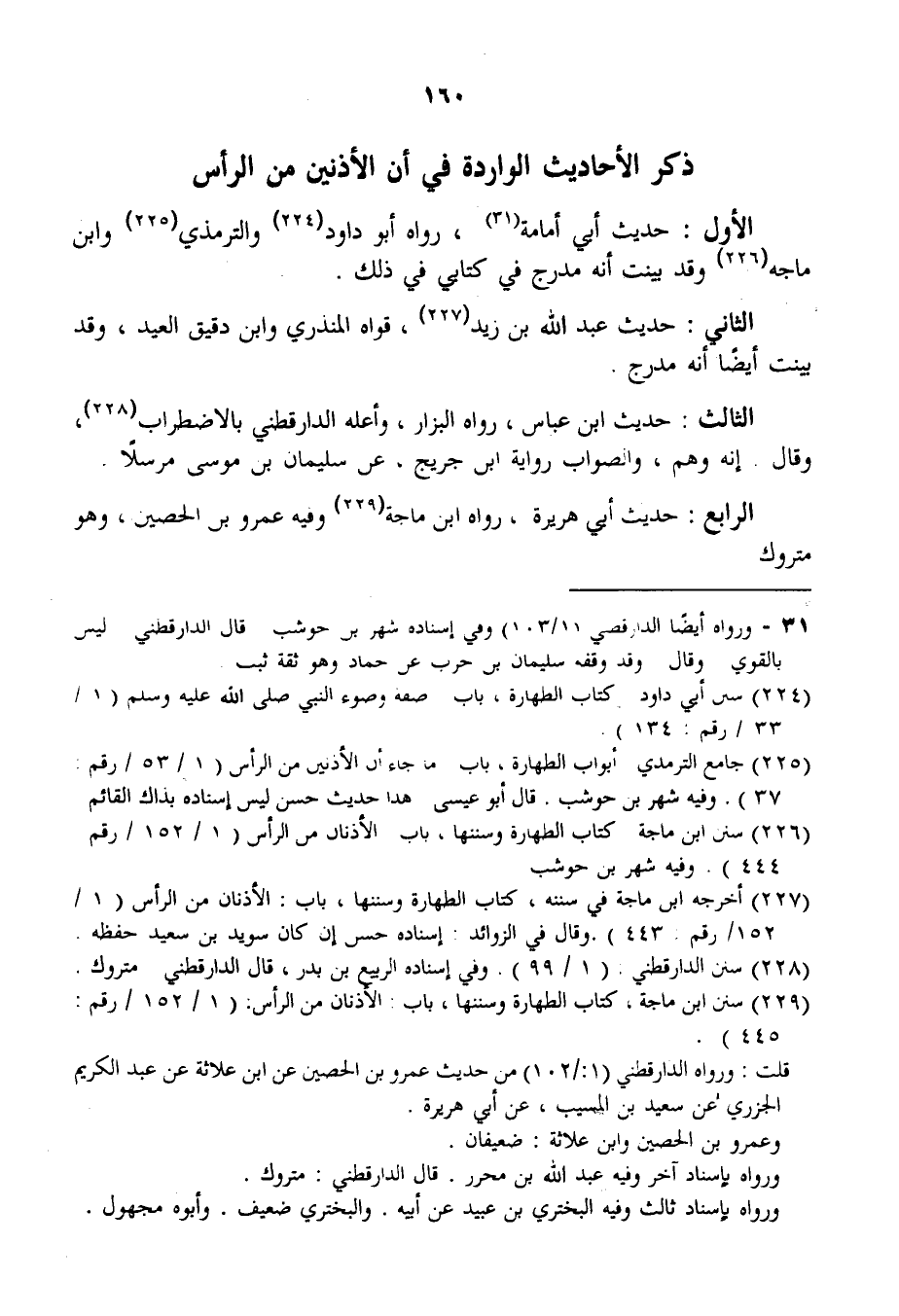 ذِكْرُ الْأَحَادِيثِ الْوَارِدَةِ فِي أَنَّ الْأُذُنَيْنِ مِنْ الرَّأْسِ الْأَوَّلُ: حَدِيثُ أَبِي أُمَامَةَ، رَوَاهُ أَبُو دَاوُد وَالتِّرْمِذِيُّ وَابْنُ مَاجَهْ وَقَدْ بَيَّنْتُ أَنَّهُ مُدْرَجٌ فِي كِتَابِي فِي ذَلِكَ.