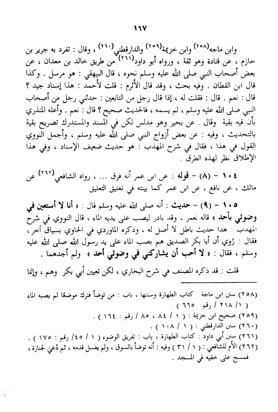 105 - (9) - حَدِيثُ: أَنَّهُ - صَلَّى اللَّهُ عَلَيْهِ وَسَلَّمَ - قَالَ. «أَنَا لَا أَسْتَعِينُ فِي وُضُوئِي بِأَحَدٍ قَالَهُ لِعُمَرَ، وَقَدْ بَادَرَ لِيَصُبَّ عَلَى يَدَيْهِ الْمَاءَ» ، قَالَ النَّوَوِيُّ فِي شَرْحِ الْمُهَذَّبِ: هَذَا حَدِيثٌ بَاطِلٌ لَا أَصْلَ لَهُ، وَذَكَرَهُ الْمَاوَرْدِيُّ فِي الْحَاوِي بِسِيَاقٍ آخَرَ فَقَالَ: رُوِيَ «أَنَّ أَبَا بَكْرٍ الصِّدِّيقَ هَمَّ بِصَبِّ الْمَاءِ عَلَى يَدِ رَسُولِ اللَّهِ - صَلَّى اللَّهُ عَلَيْهِ وَسَلَّمَ -، فَقَالَ: لَا أُحِبُّ أَنْ يُشَارِكَنِي فِي وُضُوئِي أَحَدٌ» وَلَمْ أَجِدْهُمَا قُلْتُ: قَدْ ذَكَرَهُ الْمُصَنِّفُ فِي شَرْحِ الْبُخَارِيِّ، لَكِنَّ تَعْيِينَ أَبِي بَكْرٍ وَهْمٌ، وَإِنَّمَا
