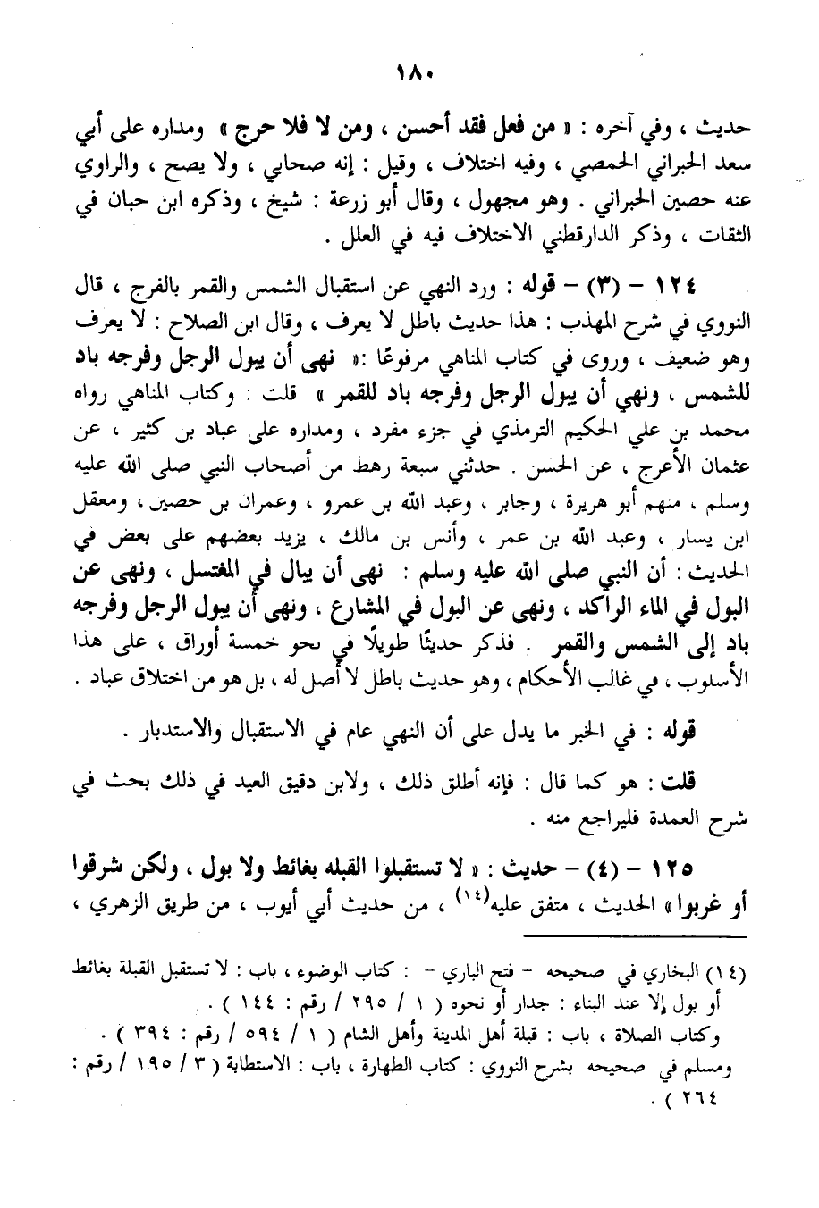 124 - (3) - قَوْلُهُ: وَرَدَ النَّهْيُ عَنْ اسْتِقْبَالِ الشَّمْسِ وَالْقَمَرِ بِالْفَرْجِ، قَالَ النَّوَوِيُّ فِي شَرْحِ الْمُهَذَّبِ: هَذَا حَدِيثٌ بَاطِلٌ لَا يُعْرَفُ، وَقَالَ ابْنُ الصَّلَاحِ: لَا يُعْرَفُ وَهُوَ ضَعِيفٌ، وَرُوِيَ فِي كِتَابِ الْمَنَاهِي مَرْفُوعًا: «نَهَى أَنْ يَبُولَ الرَّجُلُ وَفَرْجُهُ بَادٍ لِلشَّمْسِ، وَنَهَى أَنْ يَبُولَ الرَّجُلُ وَفَرْجُهُ بَادٍ لِلْقَمَرِ» قُلْتُ وَكِتَابُ الْمَنَاهِي رَوَاهُ مُحَمَّدُ بْنُ عَلِيٍّ الْحَكِيمُ التِّرْمِذِيُّ فِي جُزْءٍ مُفْرَدٍ، وَمَدَارُهُ عَلَى عَبَّادِ بْنِ كَثِيرٍ، عَنْ عُثْمَانَ الْأَعْرَجِ، عَنْ الْحَسَنِ، حَدَّثَنِي سَبْعَةُ رَهْطٍ مِنْ أَصْحَابِ النَّبِيِّ - صَلَّى اللَّهُ عَلَيْهِ وَسَلَّمَ - مِنْهُمْ أَبُو هُرَيْرَةَ، وَجَابِرٌ، وَعَبْدُ اللَّهِ بْنُ عَمْرٍو، وَعِمْرَانُ بْنُ حُصَيْنٍ، وَمَعْقِلُ بْنُ يَسَارٍ، وَعَبْدُ اللَّهِ بْنُ عُمَرَ، وَأَنَسُ بْنُ مَالِكٍ، يَزِيدُ بَعْضُهُمْ عَلَى بَعْضٍ فِي الْحَدِيثِ: «أَنَّ النَّبِيَّ - صَلَّى اللَّهُ عَلَيْهِ وَسَلَّمَ -: نَهَى أَنْ يُبَالَ فِي الْمُغْتَسَلِ، وَنَهَى عَنْ الْبَوْلِ فِي الْمَاءِ الرَّاكِدِ، وَنَهَى عَنْ الْبَوْلِ فِي الْمَشَارِعِ، وَنَهَى أَنْ يَبُولَ الرَّجُلُ وَفَرْجُهُ بَادٍ إلَى الشَّمْسِ وَالْقَمَرِ» . فَذَكَرَ حَدِيثًا طَوِيلًا فِي نَحْوِ خَمْسَةِ أَوْرَاقٍ، عَلَى هَذَا الْأُسْلُوبِ، فِي غَالِبِ الْأَحْكَامِ، وَهُوَ حَدِيثٌ بَاطِلٌ لَا أَصْلَ لَهُ، بَلْ هُوَ مِنْ اخْتِلَاقِ عَبَّادٍ.