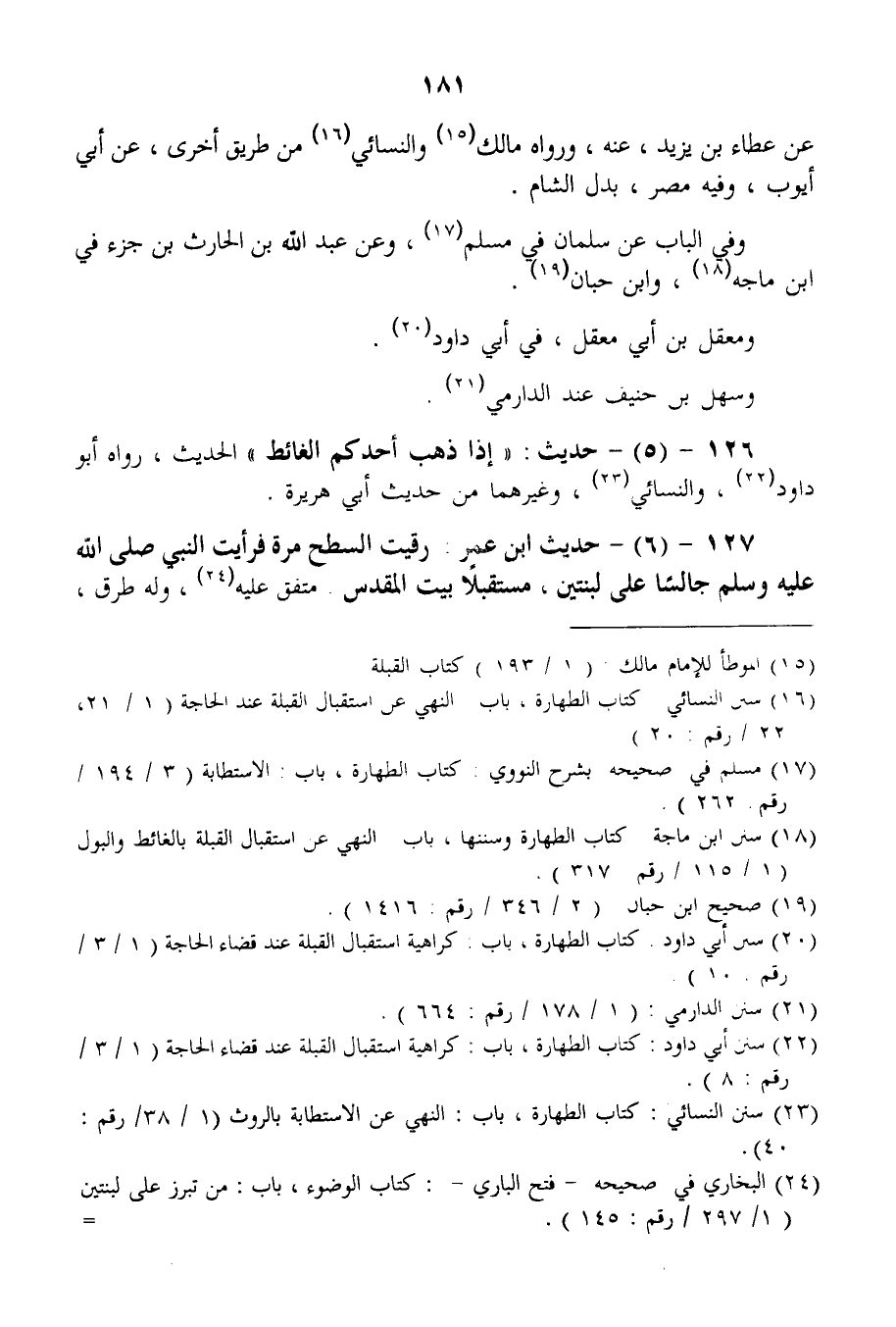 127 - (6) - حَدِيثُ ابْنِ عُمَرَ: «رَقَيْتُ السَّطْحَ مَرَّةً فَرَأَيْتُ النَّبِيَّ - صَلَّى اللَّهُ عَلَيْهِ وَسَلَّمَ - جَالِسًا عَلَى لَبِنَتَيْنِ، مُسْتَقْبِلًا بَيْتَ الْمَقْدِسِ» مُتَّفَقٌ عَلَيْهِ، وَلَهُ طُرُقٌ،