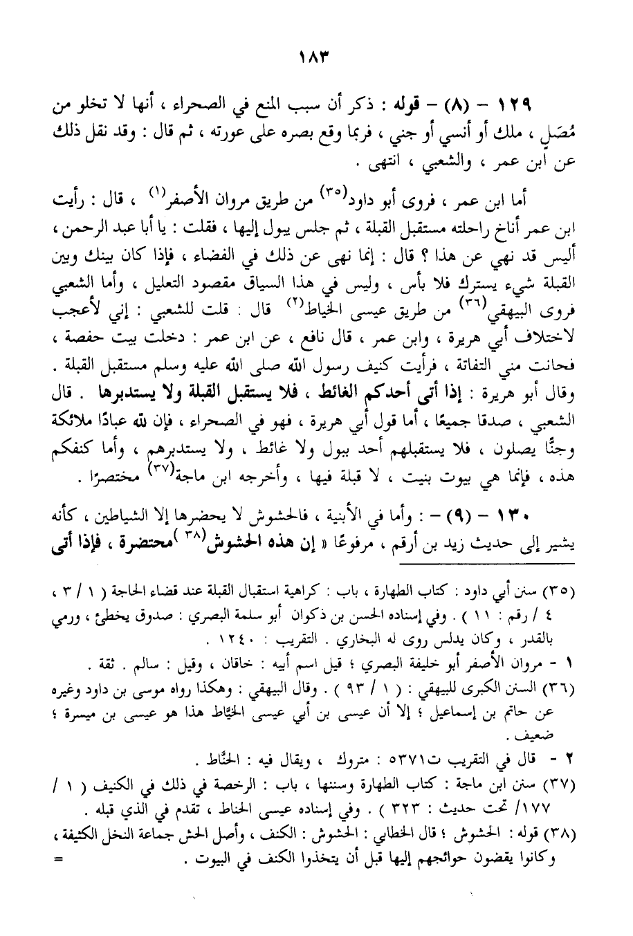 130 - (9) -: وَأَمَّا فِي الْأَبْنِيَةِ، فَالْحُشُوشُ لَا يَحْضُرُهَا إلَّا الشَّيَاطِينُ، كَأَنَّهُ يُشِيرُ إلَى حَدِيثِ زَيْدِ بْنِ أَرْقَمَ، مَرْفُوعًا «إنَّ هَذِهِ الْحُشُوشَ مُحْتَضَرَةٌ، فَإِذَا أَتَى