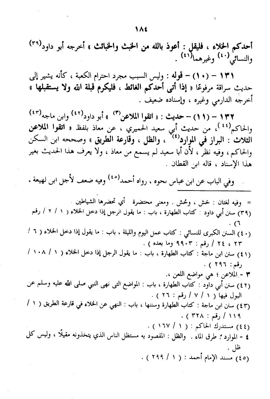 132 - (11) - حَدِيثُ: «اتَّقُوا الْمَلَاعِنَ» أَبُو دَاوُد وَابْنُ مَاجَهْ وَالْحَاكِمُ، مِنْ حَدِيثِ أَبِي سَعِيدٍ الْحِمْيَرِيِّ، عَنْ مُعَاذٍ بِلَفْظِ «اتَّقُوا الْمَلَاعِنَ الثَّلَاثَ: الْبَزَّازُ فِي الْمَوَارِدِ، وَالظِّلِّ، وَقَارِعَةِ الطَّرِيقِ» وَصَحَّحَهُ ابْنُ السَّكَنِ وَالْحَاكِمُ، وَفِيهِ نَظَرٌ، لِأَنَّ أَبَا سَعِيدٍ لَمْ يَسْمَعْ مِنْ مُعَاذٍ، وَلَا يُعْرَفُ هَذَا الْحَدِيثُ بِغَيْرِ هَذَا الْإِسْنَادِ، قَالَهُ ابْنُ الْقَطَّانِ وَفِي الْبَابِ عَنْ ابْنِ عَبَّاسٍ نَحْوُهُ، رَوَاهُ أَحْمَدُ وَفِيهِ ضَعْفٌ لِأَجْلِ ابْنِ لَهِيعَةَ،