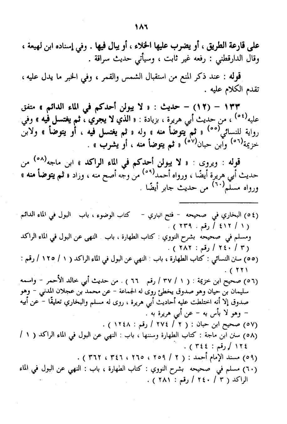 133 - (12) - حَدِيثُ: «لَا يَبُولَنَّ أَحَدُكُمْ فِي الْمَاءِ الدَّائِمِ مُتَّفَقٌ عَلَيْهِ، مِنْ حَدِيثِ أَبِي هُرَيْرَةَ، بِزِيَادَةِ: الَّذِي لَا يَجْرِي، ثُمَّ يَغْتَسِلُ فِيهِ وَفِي رِوَايَةٍ لِلنَّسَائِيِّ ثُمَّ يَتَوَضَّأُ مِنْهُ وَلَهُ ثُمَّ يَغْتَسِلُ فِيهِ، أَوْ يَتَوَضَّأُ وَلِابْنِ خُزَيْمَةَ وَابْنِ حِبَّانَ ثُمَّ يَتَوَضَّأُ مِنْهُ، أَوْ يَشْرَبُ» . قَوْلُهُ: وَيُرْوَى: «لَا يَبُولَنَّ أَحَدُكُمْ فِي الْمَاءِ الرَّاكِدِ» ابْنُ مَاجَهْ مِنْ حَدِيثِ أَبِي هُرَيْرَةَ أَيْضًا، وَرَوَاهُ أَحْمَدُ مِنْ وَجْهٍ أَصَحَّ مِنْهُ، وَزَادَ «ثُمَّ يَتَوَضَّأُ مِنْهُ» وَرَوَاهُ مُسْلِمٌ مِنْ حَدِيثِ جَابِرٍ أَيْضًا.