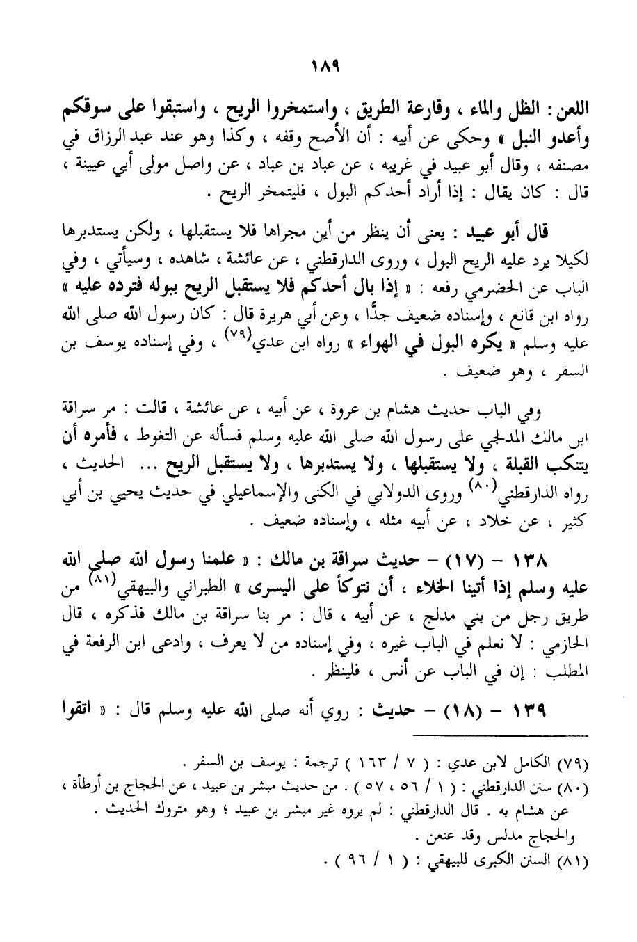اللَّعْنِ: الظِّلَّ وَالْمَاءَ، وَقَارِعَةَ الطَّرِيقِ، وَاسْتَمْخِرُوا الرِّيحَ، وَاسْتَبِقُوا عَلَى سُوقِكُمْ وَأَعِدُّوا النَّبْلَ» وَحَكَى عَنْ أَبِيهِ: أَنَّ الْأَصَحَّ وَقْفُهُ، وَكَذَا وَهُوَ عِنْدَ عَبْدِ الرَّزَّاقِ فِي مُصَنَّفِهِ، وَقَالَ أَبُو عُبَيْدٍ فِي غَرِيبِهِ، عَنْ عَبَّادِ بْنِ عَبَّادٍ، عَنْ وَاصِلٍ مَوْلَى أَبِي عُيَيْنَةَ، قَالَ: كَانَ يُقَالُ: إذَا أَرَادَ أَحَدُكُمْ الْبَوْلَ، فَلْيَتَمَخَّر الرِّيحَ. قَالَ أَبُو عُبَيْدٍ: يَعْنِي أَنْ يَنْظُرَ مِنْ أَيْنَ مَجْرَاهَا فَلَا يَسْتَقْبِلْهَا، وَلَكِنْ يَسْتَدْبِرْهَا لِكَيْلَا يَرُدَّ عَلَيْهِ الرِّيحُ الْبَوْلَ، وَرَوَى الدَّارَقُطْنِيُّ، عَنْ عَائِشَةَ، شَاهِدَهُ، وَسَيَأْتِي، وَفِي الْبَابِ عَنْ الْحَضْرَمِيِّ رَفَعَهُ: «إذَا بَالَ أَحَدُكُمْ فَلَا يَسْتَقْبِلْ الرِّيحَ بِبَوْلِهِ فَتَرُدُّهُ عَلَيْهِ» رَوَاهُ ابْنُ قَانِعٍ، وَإِسْنَادُهُ ضَعِيفٌ جِدًّا، وَعَنْ أَبِي هُرَيْرَةَ قَالَ: «كَانَ رَسُولُ اللَّهِ - صَلَّى اللَّهُ عَلَيْهِ وَسَلَّمَ - يَكْرَهُ الْبَوْلَ فِي الْهَوَاءِ» رَوَاهُ ابْنُ عَدِيٍّ، وَفِي إسْنَادِهِ يُوسُفُ بْنُ السَّفَرِ وَهُوَ ضَعِيفٌ.