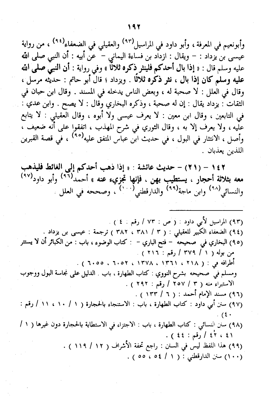 142 - (21) - حَدِيثُ عَائِشَةَ: «إذَا ذَهَبَ أَحَدُكُمْ إلَى الْغَائِطِ فَلْيَذْهَبْ مَعَهُ بِثَلَاثَةِ أَحْجَارٍ، يَسْتَطِيبُ بِهِنَّ، فَإِنَّهَا تُجْزِئُ عَنْهُ» أَحْمَدُ وَأَبُو دَاوُد وَالنَّسَائِيُّ وَابْنُ مَاجَهْ وَالدَّارَقُطْنِيّ، وَصَحَّحَهُ فِي الْعِلَلِ.