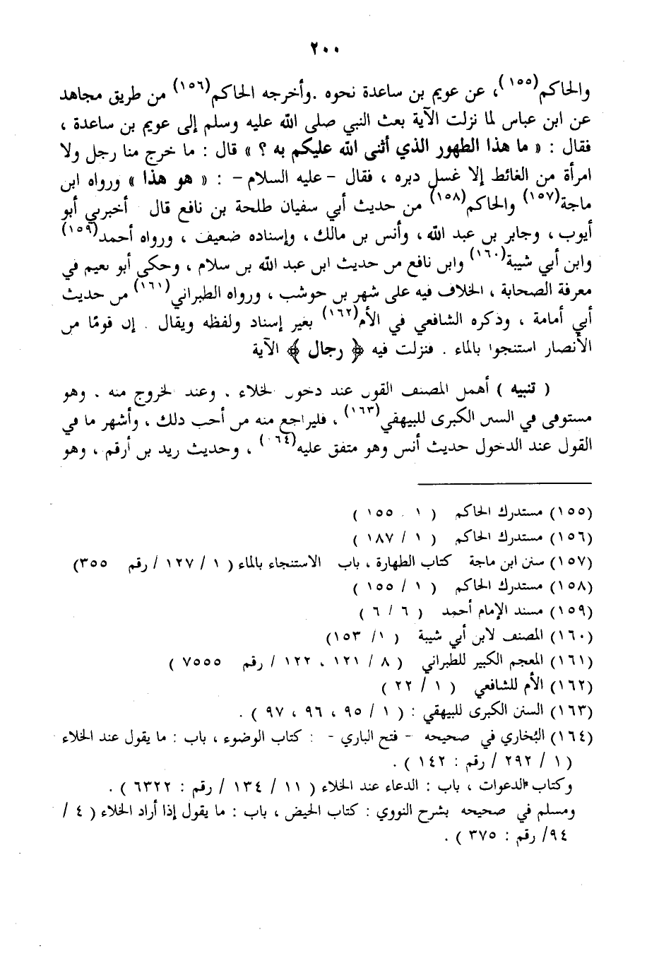 وَالْحَاكِمُ، عَنْ عُوَيْمِ بْنِ سَاعِدَةَ نَحْوَهُ. وَأَخْرَجَهُ الْحَاكِمُ مِنْ طَرِيقِ مُجَاهِدٍ عَنْ ابْنِ عَبَّاسٍ «لَمَّا نَزَلَتْ الْآيَةُ بَعَثَ النَّبِيُّ - صَلَّى اللَّهُ عَلَيْهِ وَسَلَّمَ - عُوَيْمَ بْنَ سَاعِدَةَ، فَقَالَ: مَا هَذَا الطُّهُورُ الَّذِي أَثْنَى اللَّهُ عَلَيْكُمْ بِهِ؟ قَالَ: مَا خَرَجَ مِنَّا رَجُلٌ وَلَا امْرَأَةٌ مِنْ الْغَائِطِ إلَّا غَسَلَ دُبُرَهُ، فَقَالَ - عَلَيْهِ السَّلَامُ -: هُوَ هَذَا» وَرَوَاهُ ابْنُ مَاجَهْ وَالْحَاكِمُ مِنْ حَدِيثِ أَبِي سُفْيَان طَلْحَةَ بْنِ نَافِعٍ قَالَ: أَخْبَرَنِي أَبُو أَيُّوبَ، وَجَابِرُ بْنُ عَبْدِ اللَّهِ، وَأَنَسُ بْنُ مَالِكٍ، وَإِسْنَادُهُ ضَعِيفٌ، وَرَوَاهُ أَحْمَدُ وَابْنُ أَبِي شَيْبَةَ وَابْنُ نَافِعٍ مِنْ حَدِيثِ ابْنِ عَبْدِ اللَّهِ بْنِ سَلَامٍ، وَحَكَى أَبُو نُعَيْمٍ فِي مَعْرِفَةِ الصَّحَابَةِ، الْخِلَافَ فِيهِ عَلَى شَهْرِ بْنِ حَوْشَبٍ، وَرَوَاهُ الطَّبَرَانِيُّ مِنْ حَدِيثِ أَبِي أُمَامَةَ، وَذَكَرَهُ الشَّافِعِيُّ فِي الْأُمِّ بِغَيْرِ إسْنَادٍ وَلَفْظُهُ «وَيُقَالُ: إنَّ قَوْمًا مِنْ الْأَنْصَارِ اسْتَنْجَوْا بِالْمَاءِ. فَنَزَلَتْ فِيهِ رِجَالٌ الْآيَةَ» . (تَنْبِيهٌ) أَهْمَلَ الْمُصَنِّفُ الْقَوْلَ عِنْدَ دُخُولِ الْخَلَاءِ. وَعِنْدَ الْخُرُوجِ مِنْهُ، وَهُوَ مُسْتَوْفًى فِي السُّنَنِ الْكُبْرَى لِلْبَيْهَقِيِّ، فَلْيُرَاجِعْ مِنْهُ مَنْ أَحَبَّ ذَلِكَ، وَأَشْهَرُ مَا فِي الْقَوْلِ عِنْدَ الدُّخُولِ حَدِيثُ أَنَسٍ وَهُوَ مُتَّفَقٌ عَلَيْهِ، وَحَدِيثُ زَيْدِ بْنِ أَرْقَمَ، وَهُوَ