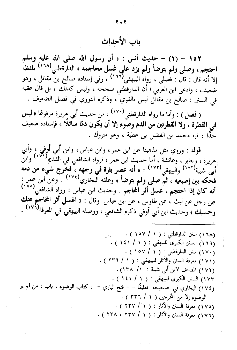 152 - (1) - حَدِيثُ أَنَسٍ: «أَنَّ رَسُولَ اللَّهِ - صَلَّى اللَّهُ عَلَيْهِ وَسَلَّمَ - احْتَجَمَ، وَصَلَّى وَلَمْ يَتَوَضَّأْ وَلَمْ يَزِدْ عَلَى غَسْلِ مَحَاجِمِهِ» الدَّارَقُطْنِيُّ بِلَفْظِهِ إلَّا أَنَّهُ قَالَ: قَالَ: فَصَلَّى، رَوَاهُ الْبَيْهَقِيُّ، وَفِي إسْنَادِهِ صَالِحُ بْنُ مُقَاتِلٍ، وَهُوَ ضَعِيفٌ، وَادَّعَى ابْنُ الْعَرَبِيِّ؛ أَنَّ الدَّارَقُطْنِيُّ صَحَّحَهُ، وَلَيْسَ كَذَلِكَ، بَلْ قَالَ عُقْبَةُ فِي السُّنَنِ: صَالِحُ بْنُ مُقَاتِلٍ لَيْسَ بِالْقَوِيِّ، وَذَكَرَهُ النَّوَوِيُّ فِي فَصْلِ الضَّعِيفِ.