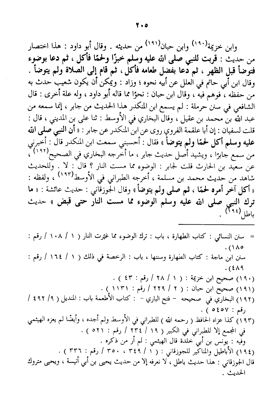 وَابْنُ خُزَيْمَةَ وَابْنُ حِبَّانَ مِنْ حَدِيثِهِ. وَقَالَ أَبُو دَاوُد: هَذَا اخْتِصَارٌ مِنْ حَدِيثِ: «قَرَّبْتُ لِلنَّبِيِّ - صَلَّى اللَّهُ عَلَيْهِ وَسَلَّمَ - خُبْزًا وَلَحْمًا فَأَكَلَ، ثُمَّ دَعَا بِوَضُوءٍ فَتَوَضَّأَ قَبْلَ الظُّهْرِ، ثُمَّ دَعَا بِفَضْلِ طَعَامِهِ فَأَكَلَ، ثُمَّ قَامَ إلَى الصَّلَاةِ وَلَمْ يَتَوَضَّأْ» . وَقَالَ ابْنُ أَبِي حَاتِمٍ فِي الْعِلَلِ عَنْ أَبِيهِ نَحْوَهُ؛ وَزَادَ: وَيُمْكِنُ أَنْ يَكُونَ شُعَيْبٌ حَدَّثَ بِهِ مَنْ حَفِظَهُ، فَوَهِمَ فِيهِ، وَقَالَ ابْنُ حِبَّانَ: نَحْوًا مِمَّا قَالَهُ أَبُو دَاوُد، وَلَهُ عِلَّةٌ أُخْرَى: قَالَ الشَّافِعِيُّ فِي سُنَنِ حَرْمَلَةَ: لَمْ يَسْمَعْ ابْنُ الْمُنْكَدِرِ هَذَا الْحَدِيثَ مِنْ جَابِرٍ، إنَّمَا سَمِعَهُ مِنْ عَبْدِ اللَّهِ بْنِ مُحَمَّدِ بْنِ عَقِيلٍ، وَقَالَ الْبُخَارِيُّ فِي الْأَوْسَطِ: ثَنَا عَلِيُّ بْنُ الْمَدِينِيِّ، قَالَ: قُلْتُ لِسُفْيَانَ: إنَّ أَبَا عَلْقَمَةَ الْفَرْوِيَّ رَوَى عَنْ ابْنِ الْمُنْكَدِرِ عَنْ جَابِرٍ: «أَنَّ النَّبِيَّ - صَلَّى اللَّهُ عَلَيْهِ وَسَلَّمَ - أَكَلَ لَحْمًا وَلَمْ يَتَوَضَّأْ» فَقَالَ: أَحْسِبُنِي سَمِعْتُ ابْنَ الْمُنْكَدِرِ قَالَ: أَخْبَرَنِي مَنْ سَمِعَ جَابِرًا، وَيُشَيِّدُ أَصْلَ حَدِيثِ جَابِرٍ، مَا أَخَرَجَهُ الْبُخَارِيُّ فِي الصَّحِيحِ، عَنْ سَعِيدِ بْنِ الْحَارِثِ قُلْتُ لِجَابِرٍ: الْوُضُوءُ مِمَّا مَسَّتْ النَّارُ؟ قَالَ: لَا.