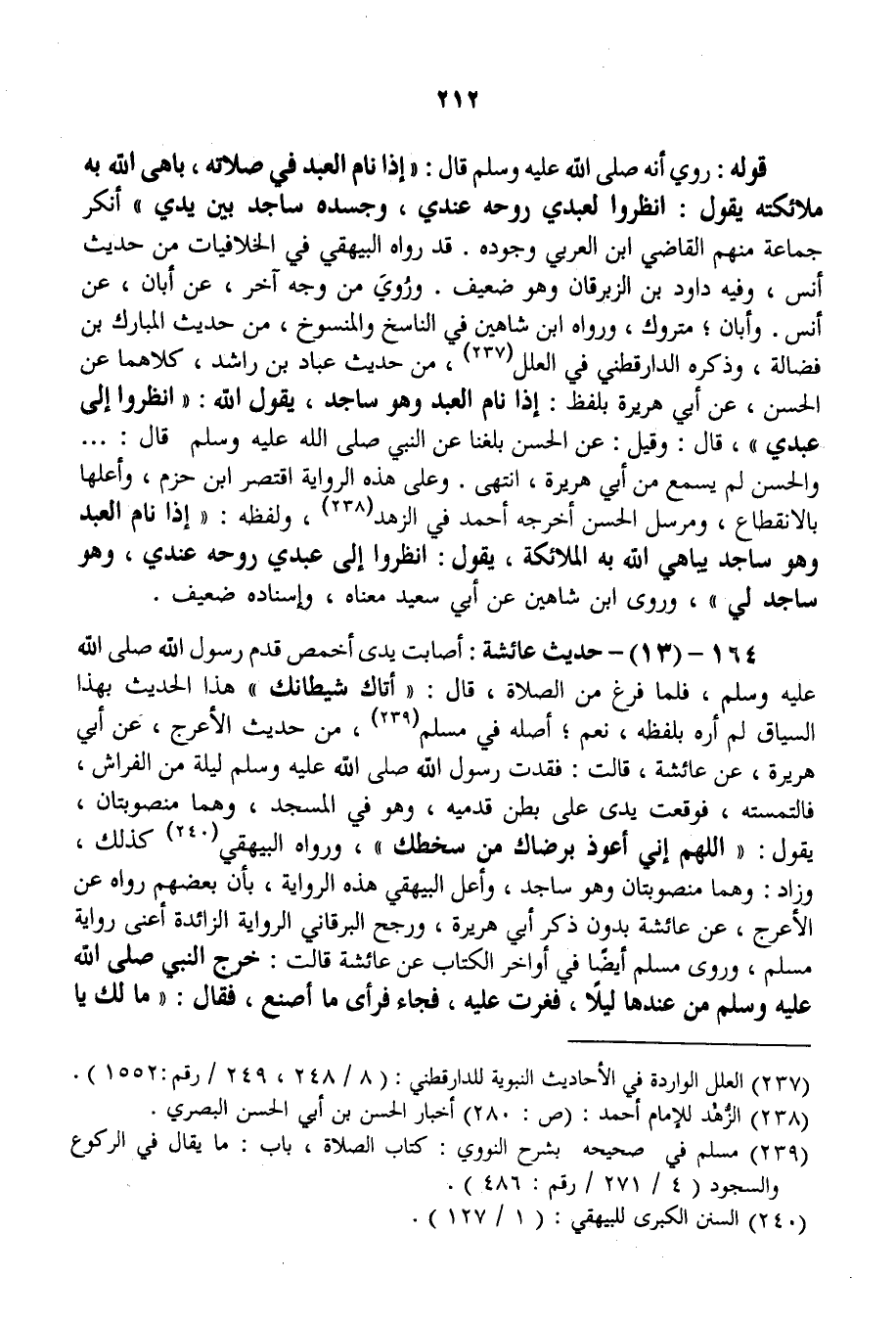 164 - (13) - حَدِيثُ «عَائِشَةَ: أَصَابَتْ يَدِي أَخْمَصَ قَدَمِ رَسُولِ اللَّهِ - صَلَّى اللَّهُ عَلَيْهِ وَسَلَّمَ -، فَلَمَّا فَرَغَ مِنْ الصَّلَاةِ، قَالَ: أَتَاكِ شَيْطَانُكِ» هَذَا الْحَدِيثُ بِهَذَا السِّيَاقِ لَمْ أَرَهُ بِلَفْظِهِ، نَعَمْ؛ أَصْلُهُ فِي مُسْلِمٍ، مِنْ حَدِيثِ الْأَعْرَجِ، عَنْ أَبِي هُرَيْرَةَ، عَنْ «عَائِشَةَ، قَالَتْ: فَقَدْتُ رَسُولَ اللَّهِ - صَلَّى اللَّهُ عَلَيْهِ وَسَلَّمَ - لَيْلَةً مِنْ الْفِرَاشِ، فَالْتَمَسْتُهُ، فَوَقَعَتْ يَدِي عَلَى بَطْنِ قَدَمَيْهِ، وَهُوَ فِي الْمَسْجِدِ، وَهُمَا مَنْصُوبَتَانِ، يَقُولُ: اللَّهُمَّ إنِّي أَعُوذَ بِرِضَاكَ مِنْ سَخَطِكَ» ، وَرَوَاهُ الْبَيْهَقِيُّ كَذَلِكَ، وَزَادَ: وَهُمَا مَنْصُوبَتَانِ وَهُوَ سَاجِدٌ، وَأَعَلَّ الْبَيْهَقِيُّ هَذِهِ الرِّوَايَةَ، بِأَنَّ بَعْضَهُمْ رَوَاهُ عَنْ الْأَعْرَجِ، عَنْ عَائِشَةَ بِدُونِ ذِكْرِ أَبِي هُرَيْرَةَ، وَرَجَّحَ الْبَرْقَانِيُّ الرِّوَايَةَ الزَّائِدَةَ أَعْنِي رِوَايَةَ مُسْلِمٍ.