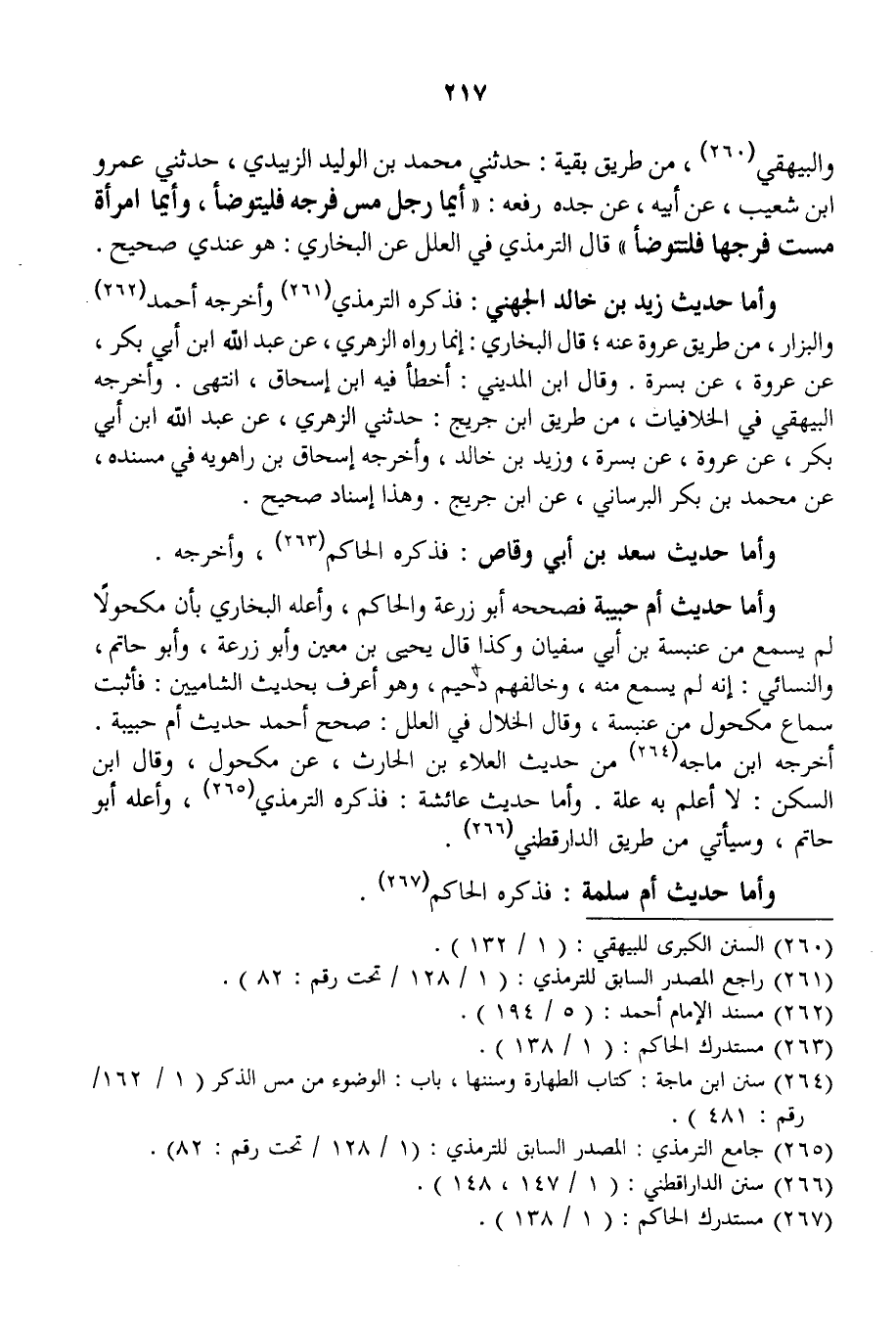 وَأَمَّا حَدِيثُ زَيْدِ بْنِ خَالِدٍ الْجُهَنِيِّ: فَذَكَرَهُ التِّرْمِذِيُّ وَأَخْرَجَهُ أَحْمَدُ وَالْبَزَّارُ، مِنْ طَرِيقِ عُرْوَةَ عَنْهُ؛ قَالَ الْبُخَارِيُّ: إنَّمَا رَوَاهُ الزُّهْرِيُّ، عَنْ عَبْدِ اللَّهِ بْنِ أَبِي بَكْرٍ، عَنْ عُرْوَةَ، عَنْ بُسْرَةَ. وَقَالَ ابْنُ الْمَدِينِيِّ: أَخْطَأَ فِيهِ ابْنُ إِسْحَاقَ، انْتَهَى وَأَخْرَجَهُ الْبَيْهَقِيّ فِي الْخِلَافِيَّاتِ، مِنْ طَرِيقِ ابْنِ جُرَيْجٍ: حَدَّثَنِي الزُّهْرِيُّ، عَنْ عَبْدِ اللَّهِ بْنِ أَبِي بَكْرٍ، عَنْ عُرْوَةَ، عَنْ بُسْرَةَ، وَزَيْدِ بْنِ خَالِدٍ، وَأَخْرَجَهُ إِسْحَاقُ بْنُ رَاهْوَيْهِ فِي مُسْنَدِهِ، عَنْ مُحَمَّدِ بْنِ بَكْرٍ الْبُرْسَانِيِّ، عَنْ ابْنِ جُرَيْجٍ. وَهَذَا إسْنَادٌ صَحِيحٌ. وَأَمَّا حَدِيثُ سَعْدِ بْنِ أَبِي وَقَّاصٍ: فَذَكَرَهُ الْحَاكِمُ، وَأَخْرَجَهُ وَأَمَّا حَدِيثُ أُمِّ حَبِيبَةَ فَصَحَّحَهُ أَبُو زُرْعَةَ وَالْحَاكِمُ، وَأَعَلَّهُ الْبُخَارِيُّ بِأَنَّ مَكْحُولًا لَمْ يَسْمَعْ مِنْ عَنْبَسَةَ بْنِ أَبِي سُفْيَانَ وَكَذَا قَالَ يَحْيَى بْنُ مَعِينٍ وَأَبُو زُرْعَةَ، وَأَبُو حَاتِمٍ، وَالنَّسَائِيُّ: إنَّهُ لَمْ يَسْمَعْ مِنْهُ، وَخَالَفَهُمْ دُحَيْمٌ، وَهُوَ أَعْرَفُ بِحَدِيثِ الشَّامِيِّينَ: فَأَثْبَتَ سَمَاعَ مَكْحُولٍ مِنْ عَنْبَسَةَ، وَقَالَ الْخَلَّالُ فِي الْعِلَلِ: صَحَّحَ أَحْمَدُ حَدِيثَ أُمِّ حَبِيبَةَ. أَخْرَجَهُ ابْنُ مَاجَهْ مِنْ حَدِيثِ الْعَلَاءِ بْنِ الْحَارِثِ، عَنْ مَكْحُولٍ.