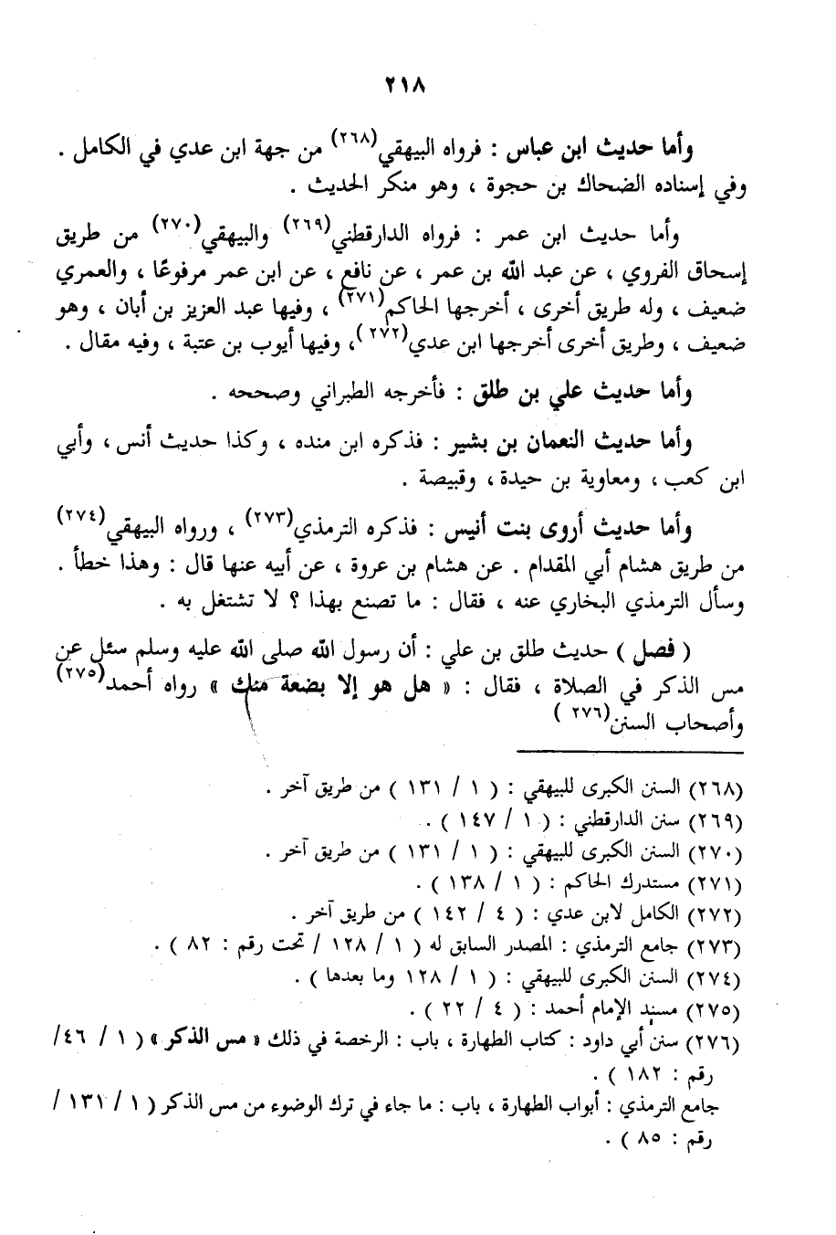 وَأَمَّا حَدِيثُ ابْنِ عَبَّاسٍ: فَرَوَاهُ الْبَيْهَقِيّ مِنْ جِهَةِ ابْنِ عَدِيٍّ فِي الْكَامِلِ. وَفِي إسْنَادِهِ الضَّحَّاكُ بْنُ حَجْوَةَ، وَهُوَ مُنْكَرُ الْحَدِيثِ. وَأَمَّا حَدِيثُ ابْنِ عُمَرَ: فَرَوَاهُ الدَّارَقُطْنِيُّ وَالْبَيْهَقِيُّ مِنْ طَرِيقِ إِسْحَاقَ الْفَرْوِيِّ، عَنْ عَبْدِ اللَّهِ بْنِ عُمَرَ، عَنْ نَافِعٍ، عَنْ ابْنِ عُمَرَ مَرْفُوعًا، وَالْعُمَرِيُّ ضَعِيفٌ، وَلَهُ طَرِيقٌ أُخْرَى، أَخْرَجَهَا الْحَاكِمُ وَفِيهَا عَبْدُ الْعَزِيزِ بْنُ أَبَانَ، وَهُوَ ضَعِيفٌ، وَطَرِيقٌ أُخْرَى أَخْرَجَهَا ابْنُ عَدِيٍّ، وَفِيهَا أَيُّوبُ بْنُ عُتْبَةَ، وَفِيهِ مَقَالٌ. وَأَمَّا حَدِيثُ عَلِيِّ بْنِ طَلْقٍ: فَأَخْرَجَهُ الطَّبَرَانِيُّ وَصَحَّحَهُ. وَأَمَّا حَدِيثُ النُّعْمَانِ بْنِ بَشِيرٍ: فَذَكَرَهُ ابْنُ مَنْدَهْ، وَكَذَا حَدِيثُ أَنَسٍ، وَأُبَيِّ بْنِ كَعْبٍ، وَمُعَاوِيَةَ بْنِ حَيْدَةَ، وَقَبِيصَةَ. وَأَمَّا حَدِيثُ أَرْوَى بِنْتِ أُنَيْسٍ: فَذَكَرَهُ التِّرْمِذِيُّ، وَرَوَاهُ الْبَيْهَقِيّ مِنْ طَرِيقِ هِشَامٍ أَبِي الْمِقْدَامِ. عَنْ هِشَامِ بْنِ عُرْوَةَ، عَنْ أَبِيهِ عَنْهَا قَالَ: وَهَذَا خَطَأٌ. وَسَأَلَ التِّرْمِذِيُّ الْبُخَارِيَّ عَنْهُ، فَقَالَ: مَا تَصْنَعُ بِهَذَا؟ لَا تَشْتَغِلْ بِهِ.