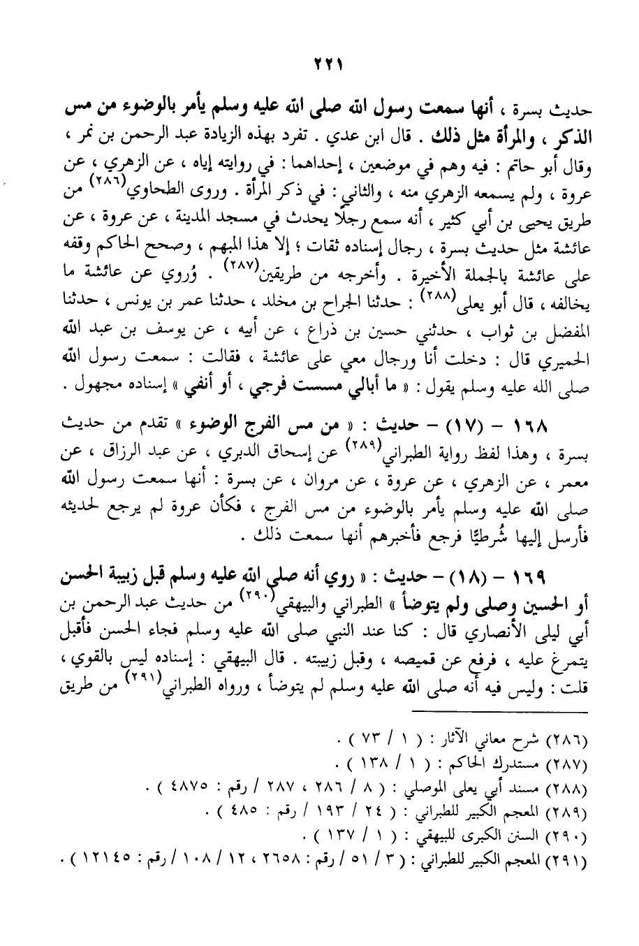 168 - (17) - حَدِيثُ: «مِنْ مَسِّ الْفَرْجِ الْوُضُوءُ» تَقَدَّمَ مِنْ حَدِيثِ بُسْرَةَ، وَهَذَا لَفْظُ رِوَايَةِ الطَّبَرَانِيِّ عَنْ إِسْحَاقَ الدَّبَرِيِّ، عَنْ عَبْدِ الرَّزَّاقِ، عَنْ مَعْمَرٍ، عَنْ الزُّهْرِيِّ، عَنْ عُرْوَةَ، عَنْ مَرْوَانَ، عَنْ «بُسْرَةَ: أَنَّهَا سَمِعَتْ رَسُولَ اللَّهِ - صَلَّى اللَّهُ عَلَيْهِ وَسَلَّمَ - يَأْمُرُ بِالْوُضُوءِ مِنْ مَسِّ الْفَرْجِ» ، فَكَأَنَّ عُرْوَةَ لَمْ يَرْجِعْ لِحَدِيثِهِ فَأَرْسَلَ إلَيْهَا شُرْطِيًّا فَرَجَعَ فَأَخْبَرَهُمْ أَنَّهَا سَمِعَتْ ذَلِكَ.