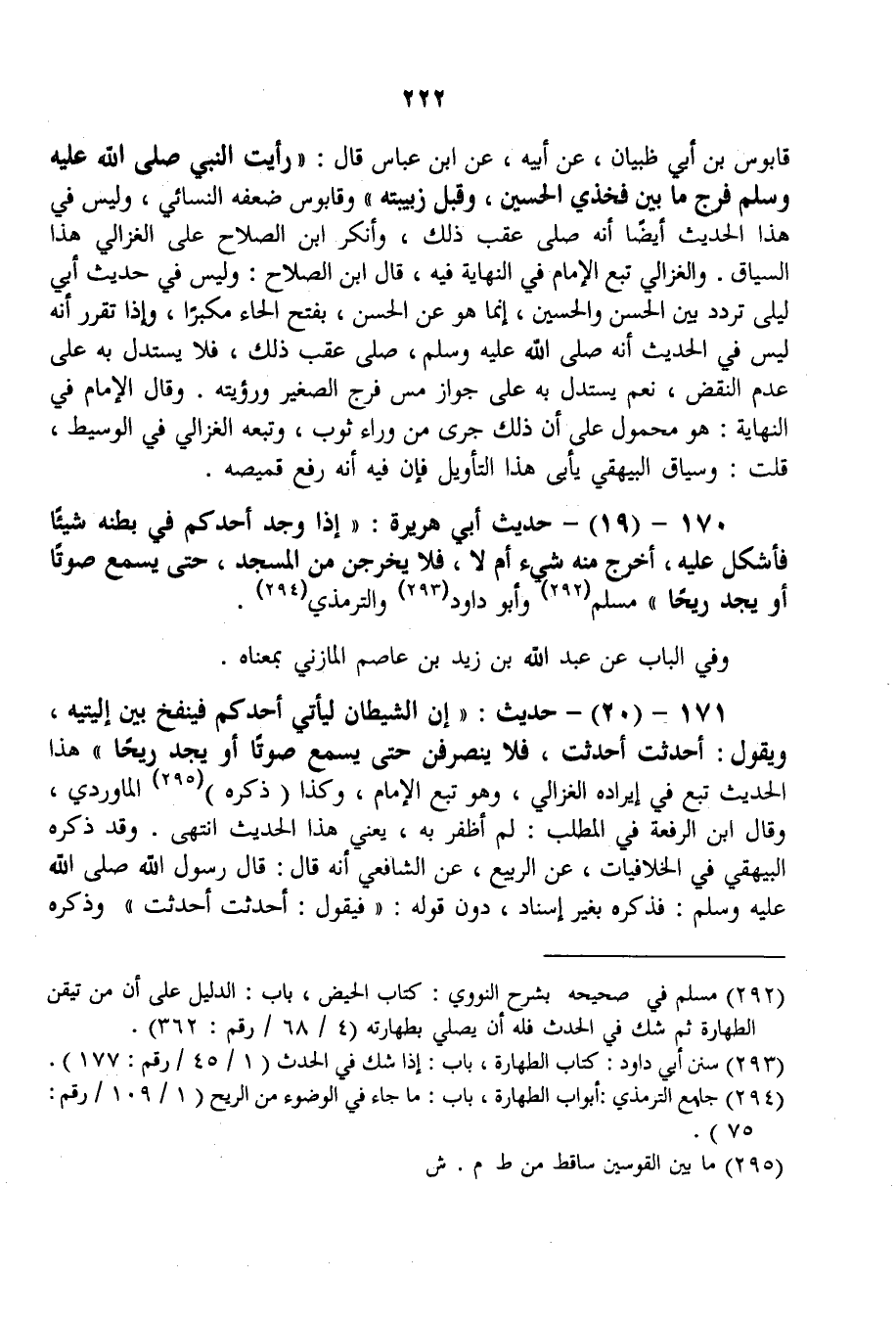 170 - (19) - حَدِيثُ أَبِي هُرَيْرَةَ: «إذَا وَجَدَ أَحَدُكُمْ فِي بَطْنِهِ شَيْئًا فَأَشْكَلَ عَلَيْهِ، أَخَرَجَ مِنْهُ شَيْءٌ أَمْ لَا، فَلَا يَخْرُجَنَّ مِنْ الْمَسْجِدِ، حَتَّى يَسْمَعَ صَوْتًا أَوْ يَجِدَ رِيحًا» مُسْلِمٌ وَأَبُو دَاوُد وَالتِّرْمِذِيُّ. وَفِي الْبَابِ عَنْ عَبْدِ اللَّهِ بْنِ زَيْدِ بْنِ عَاصِمٍ الْمَازِنِيِّ بِمَعْنَاهُ.