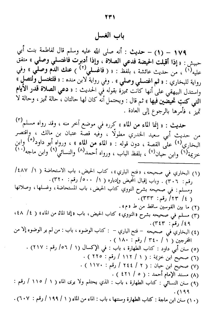 179 - (1) - حَدِيثُ: «أَنَّهُ - صَلَّى اللَّهُ عَلَيْهِ وَسَلَّمَ - قَالَ لِفَاطِمَةَ بِنْتِ أَبِي حُبَيْشٍ: إذَا أَقْبَلَتْ الْحَيْضَةُ فَدَعِي الصَّلَاةَ. وَإِذَا أَدْبَرَتْ فَاغْتَسِلِي وَصَلِّي» مُتَّفَقٌ عَلَيْهِ، مِنْ حَدِيثِ عَائِشَةَ، بِلَفْظِ: «فَاغْسِلِي عَنْكِ الدَّمَ وَصَلِّي» وَفِي رِوَايَةٍ لِلْبُخَارِيِّ: «ثُمَّ اغْتَسِلِي وَصَلِّي» . وَفِي رِوَايَةٍ لِابْنِ مَنْدَهْ: «فَلْتَغْتَسِلْ وَلْتُصَلِّ» وَاسْتَدَلَّ الْبَيْهَقِيّ عَلَى أَنَّهَا كَانَتْ مُمَيِّزَةً بِقَوْلِهِ فِي الْحَدِيثِ: «دَعِي الصَّلَاةَ قَدْرَ الْأَيَّامِ الَّتِي كُنْتِ تَحِيضِينَ فِيهَا» ثُمَّ قَالَ: وَيَحْتَمِلُ أَنَّهُ كَانَ لَهَا حَالَتَانِ، حَالَةٌ تُمَيِّزُ، وَحَالَةٌ لَا تُمَيِّزُ، فَأَمَرَهَا بِالرُّجُوعِ إلَى الْعَادَةِ.