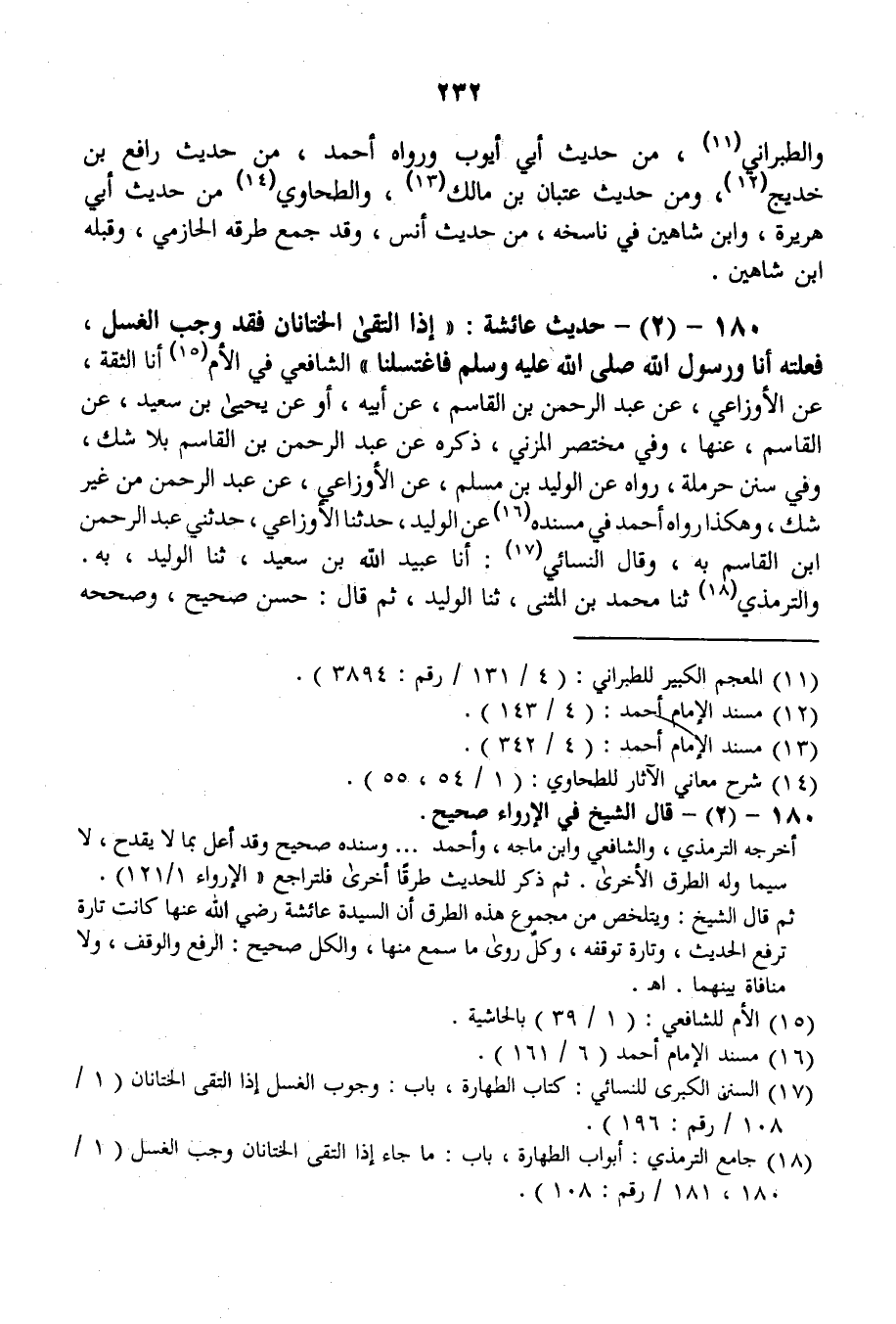 180 - (2 حَدِيثُ عَائِشَةَ: «إذَا الْتَقَى الْخِتَانَانِ فَقَدْ وَجَبَ الْغُسْلُ، فَعَلْتُهُ أَنَا وَرَسُولُ اللَّهِ - صَلَّى اللَّهُ عَلَيْهِ وَسَلَّمَ - فَاغْتَسَلْنَا» الشَّافِعِيُّ فِي الْأُمِّ أَنَا الثِّقَةُ، عَنْ الْأَوْزَاعِيِّ، عَنْ عَبْدِ الرَّحْمَنِ بْنِ الْقَاسِمِ، عَنْ أَبِيهِ، أَوْ عَنْ يَحْيَى بْنِ سَعِيدٍ، عَنْ الْقَاسِمِ، عَنْهَا، وَفِي مُخْتَصَرِ الْمُزَنِيِّ.
