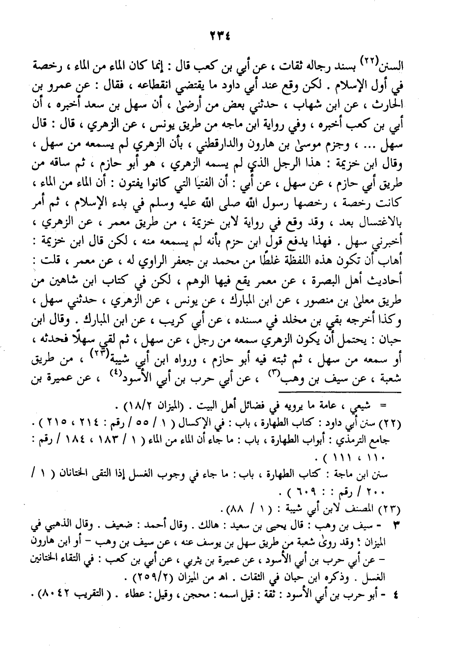السُّنَنِ بِسَنَدٍ رِجَالُهُ ثِقَاتٌ، عَنْ أُبَيِّ بْنِ كَعْبٍ قَالَ: إنَّمَا كَانَ الْمَاءُ مِنْ الْمَاءِ، رُخْصَةً فِي أَوَّلِ الْإِسْلَامِ. لَكِنْ وَقَعَ عِنْدَ أَبِي دَاوُد مَا يَقْتَضِي انْقِطَاعَهُ، فَقَالَ: عَنْ عَمْرِو بْنِ الْحَارِثِ، عَنْ ابْنِ شِهَابٍ، حَدَّثَنِي بَعْضُ مَنْ أَرْضَى، أَنَّ سَهْلَ بْنَ سَعْدٍ أَخْبَرَهُ، أَنَّ أُبَيَّ بْنَ كَعْبٍ أَخْبَرَهُ، وَفِي رِوَايَةِ ابْنِ مَاجَهْ مِنْ طَرِيقِ يُونُسَ، عَنْ الزُّهْرِيِّ، قَالَ: قَالَ سَهْلٌ. . . وَجَزَمَ مُوسَى بْنُ هَارُونُ وَالدَّارَقُطْنِيّ، بِأَنَّ الزُّهْرِيَّ لَمْ يَسْمَعْهُ مِنْ سَهْلٍ، وَقَالَ ابْنُ خُزَيْمَةَ: هَذَا الرَّجُلُ الَّذِي لَمْ يُسَمِّهِ الزُّهْرِيُّ، هُوَ أَبُو حَازِمٍ، ثُمَّ سَاقَهُ مِنْ طَرِيقِ أَبِي حَازِمٍ، عَنْ سَهْلٍ، عَنْ أُبَيِّ: أَنَّ الْفُتْيَا الَّتِي كَانُوا يُفْتُونَ: أَنَّ الْمَاءَ مِنْ الْمَاءِ، كَانَتْ رُخْصَةً، رَخَّصَهَا رَسُولُ اللَّهِ - صَلَّى اللَّهُ عَلَيْهِ وَسَلَّمَ - فِي بَدْءِ الْإِسْلَامِ، ثُمَّ أَمَرَ بِالِاغْتِسَالِ بَعْدُ، وَقَدْ وَقَعَ فِي رِوَايَةٍ لَابْنِ خُزَيْمَةَ، مِنْ طَرِيقِ مَعْمَرٍ، عَنْ الزُّهْرِيِّ، أَخْبَرَنِي سَهْلٌ. فَهَذَا يَدْفَعُ قَوْلَ ابْنِ حَزْمٍ بِأَنَّهُ لَمْ يَسْمَعْهُ مِنْهُ، لَكِنْ قَالَ ابْنُ خُزَيْمَةَ: أَهَابُ أَنْ تَكُونَ هَذِهِ اللَّفْظَةُ غَلَطًا مِنْ مُحَمَّدِ بْنِ جَعْفَرٍ الرَّاوِي لَهُ، عَنْ مَعْمَرٍ، قُلْت: أَحَادِيثُ أَهْلِ الْبَصْرَةِ، عَنْ مَعْمَرٍ يَقَعُ فِيهَا الْوَهْمُ، لَكِنْ فِي كِتَابِ ابْنِ شَاهِينَ مِنْ طَرِيقِ مُعَلَّى بْنِ مَنْصُورٍ، عَنْ ابْنِ الْمُبَارَكِ، عَنْ يُونُسَ، عَنْ الزُّهْرِيِّ، حَدَّثَنِي سَهْلٌ، وَكَذَا أَخْرَجَهُ بَقِيَ بْنُ مَخْلَدٍ فِي مُسْنَدِهِ، عَنْ أَبِي كُرَيْبٍ، عَنْ ابْنِ الْمُبَارَكِ.