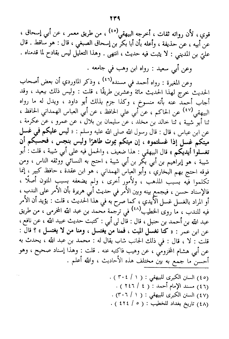قُلْتُ: يُؤَيِّدُ أَنَّ الْأَمْرَ فِيهِ لِلنَّدْبِ، مَا رَوَى الْخَطِيبُ فِي تَرْجَمَةِ مُحَمَّدِ بْنِ عَبْدِ اللَّهِ الْمَخْرَمِيِّ، مِنْ طَرِيقِ عَبْدِ اللَّهِ بْنِ أَحْمَدَ بْنِ حَنْبَلٍ، قَالَ: قَالَ لِي أَبِي: كَتَبْتُ حَدِيثَ عُبَيْدِ اللَّهِ، عَنْ نَافِعٍ، عَنْ ابْنِ عُمَرَ: كُنَّا نُغَسِّلُ الْمَيِّتَ، فَمِنَّا مَنْ يَغْتَسِلُ، وَمِنَّا مَنْ لَا يَغْتَسِلُ "؟ قَالَ: قُلْت: لَا، قَالَ: فِي ذَلِكَ الْجَانِبِ شَابٌّ يُقَالُ لَهُ: مُحَمَّدُ بْنُ عَبْدِ اللَّهِ، يُحَدِّثُ بِهِ عَنْ أَبِي هِشَامٍ الْمَخْزُومِيِّ، عَنْ وُهَيْبٍ فَاكْتُبْهُ عَنْهُ. قُلْت: وَهَذَا إسْنَادٌ صَحِيحٌ، وَهُوَ أَحْسَنُ مَا جَمَعَ بِهِ بَيْنَ مُخْتَلِفِ هَذِهِ الْأَحَادِيثِ، وَاَللَّهُ أَعْلَمُ