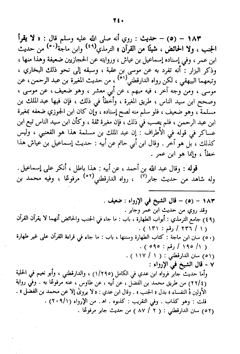 حَدِيثُ: رُوِيَ أَنَّهُ - صَلَّى اللَّهُ عَلَيْهِ وَسَلَّمَ - قَالَ: «لَا يَقْرَأُ الْجُنُبُ، وَلَا الْحَائِضُ، شَيْئًا مِنْ الْقُرْآنِ» التِّرْمِذِيُّ وَابْنُ مَاجَهْ مِنْ حَدِيثِ ابْنِ عُمَرَ، وَفِي إسْنَادِهِ إسْمَاعِيلُ بْنُ عَيَّاشٍ، وَرِوَايَتُهُ عَنْ الْحِجَازِيِّينَ ضَعِيفَةٌ وَهَذَا مِنْهَا، وَذَكَرَ الْبَزَّارُ: أَنَّهُ تَفَرَّدَ بِهِ عَنْ مُوسَى بْنِ عُقْبَةَ، وَسَبَقَهُ إلَى نَحْوِ ذَلِكَ الْبُخَارِيُّ، وَتَبِعَهُمَا الْبَيْهَقِيُّ، لَكِنْ رَوَاهُ الدَّارَقُطْنِيُّ، مِنْ حَدِيثِ الْمُغِيرَةِ بْنِ عَبْدِ الرَّحْمَنِ، عَنْ مُوسَى، وَمِنْ وَجْهٍ آخَرَ، فِيهِ مُبْهَمٌ، عَنْ أَبِي مَعْشَرٍ، وَهُوَ ضَعِيفٌ، عَنْ مُوسَى، وَصَحَّحَ ابْنُ سَيِّدِ النَّاسِ، طَرِيقَ الْمُغِيرَةِ، وَأَخْطَأَ فِي ذَلِكَ، فَإِنَّ فِيهَا عَبْدَ الْمَلِكِ بْنَ مَسْلَمَةَ، وَهُوَ ضَعِيفٌ، فَلَوْ سَلِمَ مِنْهُ لَصَحَّ إسْنَادُهُ، وَإِنْ كَانَ ابْنُ الْجَوْزِيِّ ضَعَّفَهُ بِمُغِيرَةَ بْنِ عَبْدِ الرَّحْمَنِ، فَلَمْ يُصِبْ فِي ذَلِكَ، فَإِنَّ مُغِيرَةَ ثِقَةٌ، وَكَأَنَّ ابْنَ سَيِّدِ النَّاسِ تَبِعَ ابْنَ عَسَاكِرَ فِي قَوْلِهِ فِي الْأَطْرَافِ: إنَّ عَبْدَ الْمَلِكِ بْنَ مَسْلَمَةَ هَذَا هُوَ الْقَعْنَبِيُّ، وَلَيْسَ كَذَلِكَ، بَلْ هُوَ آخَرُ.