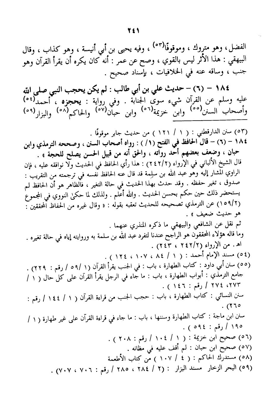 184 - (6) - حَدِيثُ عَلِيِّ بْنِ أَبِي طَالِبٍ: «لَمْ يَكُنْ يَحْجُبُ النَّبِيَّ - صَلَّى اللَّهُ عَلَيْهِ وَسَلَّمَ - عَنْ الْقُرْآنِ شَيْءٌ سِوَى الْجَنَابَةِ» . وَفِي رِوَايَةٍ: يَحْجِزُهُ، أَحْمَدُ وَأَصْحَابُ السُّنَنِ وَابْنُ خُزَيْمَةَ وَابْنُ حِبَّانَ وَالْحَاكِمُ وَالْبَزَّارُ