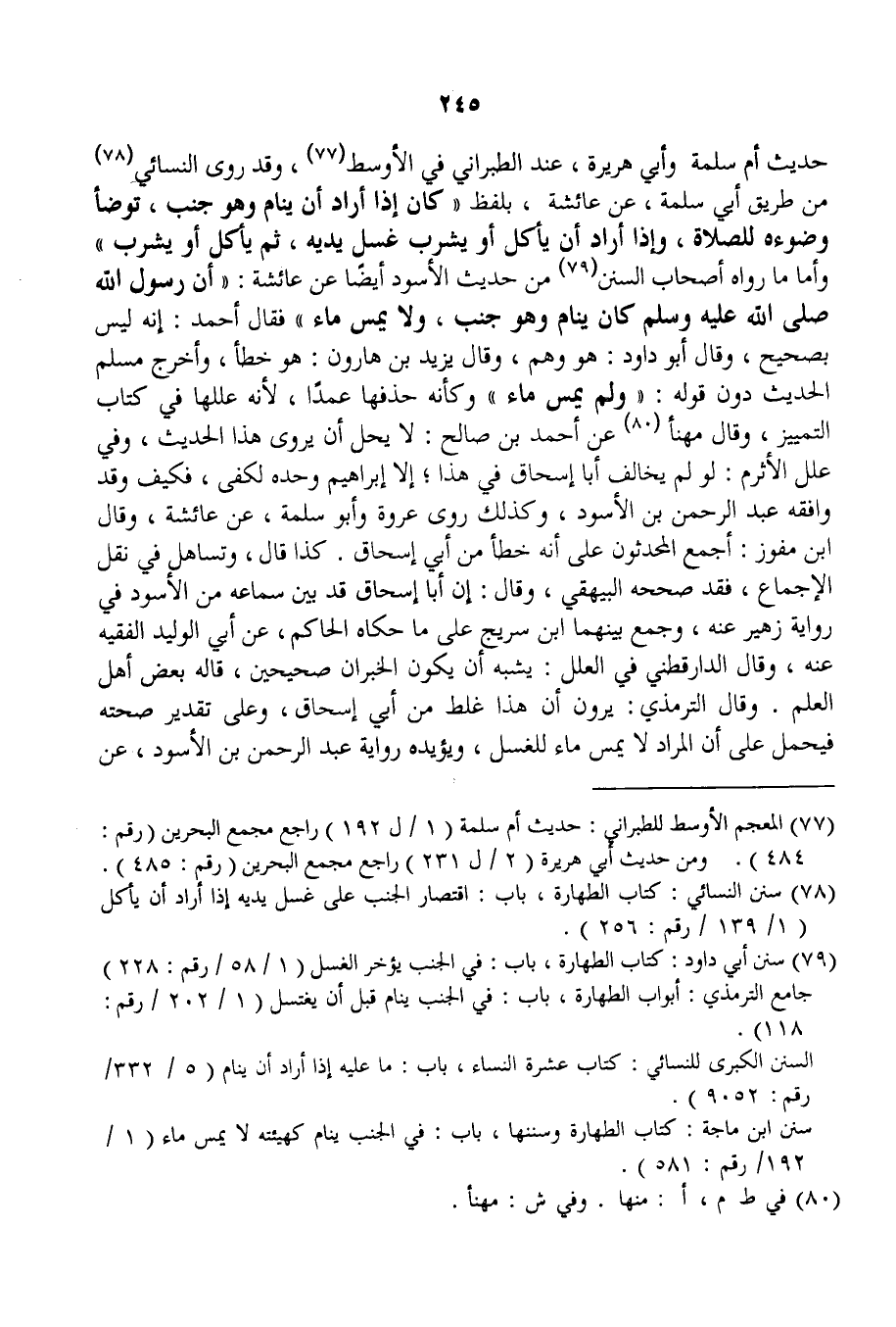 حَدِيثِ أُمِّ سَلَمَةَ وَأَبِي هُرَيْرَةَ، عِنْدَ الطَّبَرَانِيِّ فِي الْأَوْسَطِ، وَقَدْ رَوَى النَّسَائِيُّ مِنْ طَرِيقِ أَبِي سَلَمَةَ، عَنْ عَائِشَةَ، بِلَفْظِ «كَانَ إذَا أَرَادَ أَنْ يَنَامَ وَهُوَ جُنُبٌ، تَوَضَّأَ وُضُوءَهُ لِلصَّلَاةِ، وَإِذَا أَرَادَ أَنْ يَأْكُلَ أَوْ يَشْرَبَ غَسَلَ يَدَيْهِ، ثُمَّ يَأْكُلُ أَوْ يَشْرَبُ» وَأَمَّا مَا رَوَاهُ أَصْحَابُ السُّنَنِ مِنْ حَدِيثِ الْأَسْوَدِ أَيْضًا عَنْ عَائِشَةَ: «أَنَّ رَسُولَ اللَّهِ - صَلَّى اللَّهُ عَلَيْهِ وَسَلَّمَ - كَانَ يَنَامُ وَهُوَ جُنُبٌ، وَلَا يَمَسُّ مَاءً» فَقَالَ أَحْمَدُ: إنَّهُ لَيْسَ بِصَحِيحٍ، وَقَالَ أَبُو دَاوُد: هُوَ وَهْمٌ، وَقَالَ يَزِيدُ بْنُ هَارُونُ: هُوَ خَطَأٌ، وَأَخْرَجَ مُسْلِمٌ الْحَدِيثَ دُونَ قَوْلِهِ: وَلَمْ يَمَسَّ مَاءً " وَكَأَنَّهُ حَذَفَهَا عَمْدًا، لِأَنَّهُ عَلَّلَهَا فِي كِتَابِ التَّمْيِيزِ، وَقَالَ مُهَنَّا عَنْ أَحْمَدَ بْنِ صَالِحٍ: لَا يَحِلُّ أَنْ يُرْوَى هَذَا الْحَدِيثُ، وَفِي عِلَلِ الْأَثْرَمِ: لَوْ لَمْ يُخَالِفْ أَبَا إِسْحَاقَ فِي هَذَا؛ إلَّا إبْرَاهِيمُ وَحْدَهُ لَكَفَى.