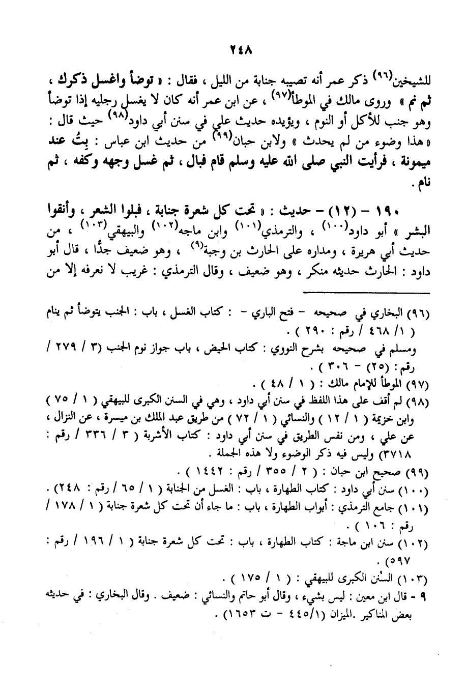 190 - (12) - حَدِيثُ: «تَحْتَ كُلِّ شَعْرَةٍ جَنَابَةٌ، فَبُلُّوا الشَّعْرَ، وَأَنْقُوا الْبَشَرَةَ» أَبُو دَاوُد، وَالتِّرْمِذِيُّ وَابْنُ مَاجَهْ وَالْبَيْهَقِيُّ، مِنْ حَدِيثِ أَبِي هُرَيْرَةَ، وَمَدَارُهُ عَلَى الْحَارِثِ بْنِ وَجِيهٍ، وَهُوَ ضَعِيفٌ جِدًّا، قَالَ أَبُو دَاوُد: الْحَارِثُ حَدِيثُهُ مُنْكَرٌ، وَهُوَ ضَعِيفٌ، وَقَالَ التِّرْمِذِيُّ: غَرِيبٌ لَا نَعْرِفُهُ إلَّا مِنْ