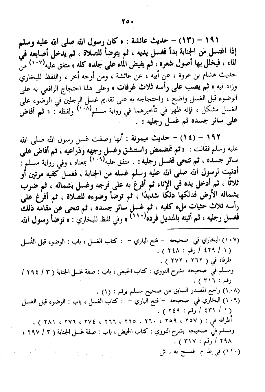 192 - (14) - حَدِيثُ «مَيْمُونَةَ: أَنَّهَا وَصَفَتْ غُسْلَ رَسُولِ اللَّهِ - صَلَّى اللَّهُ عَلَيْهِ وَسَلَّمَ - فَقَالَتْ: ثُمَّ تَمَضْمَضَ وَاسْتَنْشَقَ وَغَسَلَ وَجْهَهُ وَذِرَاعَيْهِ، ثُمَّ أَفَاضَ عَلَى سَائِرِ جَسَدِهِ، ثُمَّ تَنَحَّى فَغَسَلَ رِجْلَيْهِ» . مُتَّفَقٌ عَلَيْهِ بِمَعْنَاهُ، وَفِي رِوَايَةِ مُسْلِمٍ: «أَدْنَيْت لِرَسُولِ اللَّهِ - صَلَّى اللَّهُ عَلَيْهِ وَسَلَّمَ - غُسْلَهُ مِنْ الْجَنَابَةِ، فَغَسَلَ كَفَّيْهِ مَرَّتَيْنِ أَوْ ثَلَاثًا، ثُمَّ أَدْخَلَ يَدَهُ فِي الْإِنَاءِ ثُمَّ أَفْرَغَ بِهِ عَلَى فَرْجِهِ وَغَسَلَ بِشِمَالِهِ، ثُمَّ ضَرَبَ بِشِمَالِهِ الْأَرْضَ فَدَلَكَهَا دَلْكًا شَدِيدًا، ثُمَّ تَوَضَّأَ وُضُوءَهُ لِلصَّلَاةِ، ثُمَّ أَفْرَغَ عَلَى رَأْسِهِ ثَلَاثَ حَثَيَاتٍ مِلْءَ كَفَّيْهِ، ثُمَّ غَسَلَ سَائِرَ جَسَدِهِ، ثُمَّ تَنَحَّى عَنْ مَقَامِهِ ذَلِكَ فَغَسَلَ رِجْلَيْهِ، ثُمَّ أَتَيْته بِالْمِنْدِيلِ فَرَدَّهُ» وَفِي لَفْظٍ لِلْبُخَارِيِّ: «تَوَضَّأَ رَسُولُ اللَّهِ