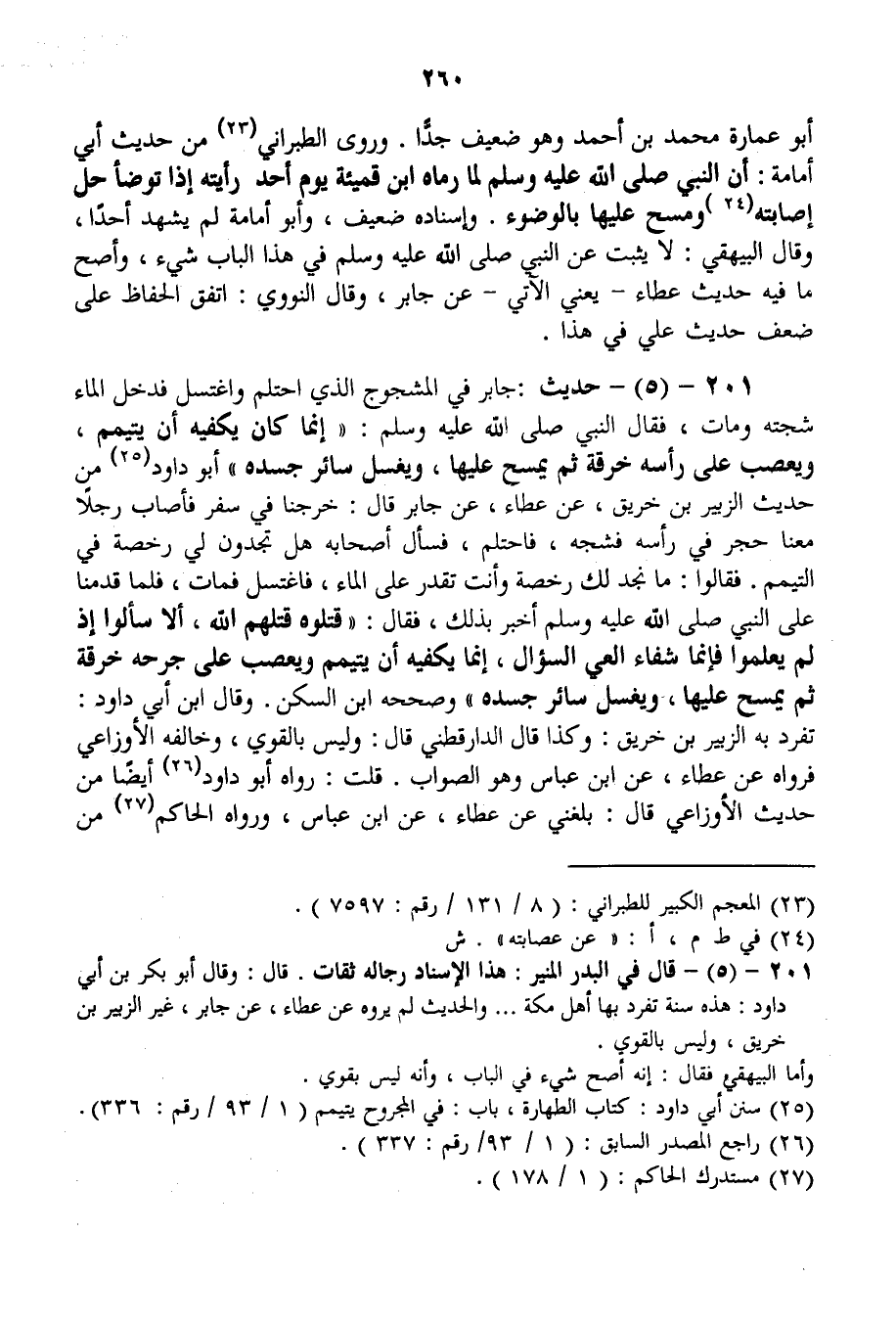 201 - (5) - حَدِيثُ: جَابِرٍ «فِي الْمَشْجُوجِ الَّذِي احْتَلَمَ وَاغْتَسَلَ فَدَخَلَ الْمَاءُ شَجَّتَهُ وَمَاتَ، فَقَالَ النَّبِيُّ - صَلَّى اللَّهُ عَلَيْهِ وَسَلَّمَ -: إنَّمَا كَانَ يَكْفِيهِ أَنْ يَتَيَمَّمَ، وَيَعْصِبَ عَلَى رَأْسِهِ خِرْقَةً ثُمَّ يَمْسَحَ عَلَيْهَا، وَيَغْسِلَ سَائِرَ جَسَدِهِ» أَبُو دَاوُد مِنْ حَدِيثِ الزُّبَيْرِ بْنِ خُرَيْقٍ، عَنْ عَطَاءٍ، عَنْ جَابِرٍ قَالَ: «خَرَجْنَا فِي سَفَرٍ فَأَصَابَ رَجُلًا مَعَنَا حَجَرٌ فِي رَأْسِهِ فَشَجَّهُ، فَاحْتَلَمَ، فَسَأَلَ أَصْحَابَهُ هَلْ تَجِدُونَ لِي رُخْصَةً فِي التَّيَمُّمِ؟ فَقَالُوا: مَا نَجِدُ لَك رُخْصَةً وَأَنْتَ تَقْدِرُ عَلَى الْمَاءِ، فَاغْتَسَلَ فَمَاتَ، فَلَمَّا قَدِمْنَا عَلَى النَّبِيِّ - صَلَّى اللَّهُ عَلَيْهِ وَسَلَّمَ - أُخْبِرَ بِذَلِكَ، فَقَالَ: قَتَلُوهُ قَتَلَهُمْ اللَّهُ، أَلَا سَأَلُوا إذْ لَمْ يَعْلَمُوا فَإِنَّمَا شِفَاءُ الْعِيِّ السُّؤَالُ، إنَّمَا يَكْفِيهِ أَنْ يَتَيَمَّمَ وَيَعْصِبَ عَلَى جُرْحِهِ خِرْقَةً ثُمَّ يَمْسَحَ عَلَيْهَا، وَيَغْسِلَ سَائِرَ جَسَدِهِ» وَصَحَّحَهُ ابْنُ السَّكَنِ. وَقَالَ ابْنُ أَبِي دَاوُد: تَفَرَّدَ بِهِ الزُّبَيْرُ بْنُ خُرَيْقٍ: وَكَذَا قَالَ الدَّارَقُطْنِيُّ قَالَ: وَلَيْسَ بِالْقَوِيِّ، وَخَالَفَهُ الْأَوْزَاعِيُّ فَرَوَاهُ عَنْ عَطَاءٍ، عَنْ ابْنِ عَبَّاسٍ وَهُوَ الصَّوَابُ.