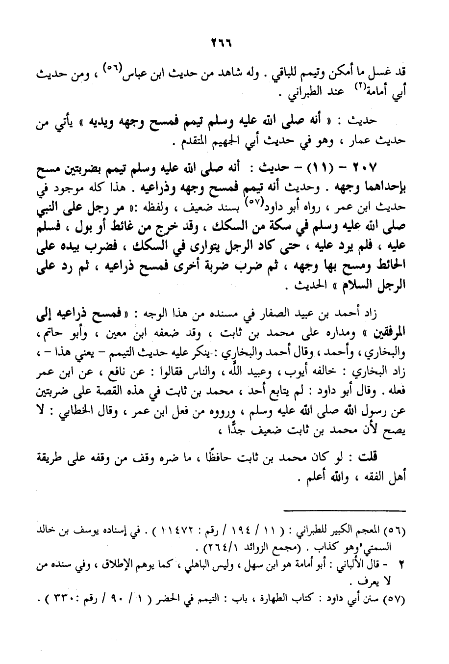 207 - (11) - حَدِيثُ: «أَنَّهُ - صَلَّى اللَّهُ عَلَيْهِ وَسَلَّمَ - تَيَمَّمَ بِضَرْبَتَيْنِ مَسَحَ بِإِحْدَاهُمَا وَجْهَهُ.» وَحَدِيثُ «أَنَّهُ تَيَمَّمَ فَمَسَحَ وَجْهَهُ وَذِرَاعَيْهِ» . هَذَا كُلُّهُ مَوْجُودٌ فِي حَدِيثِ ابْنِ عُمَرَ، رَوَاهُ أَبُو دَاوُد بِسَنَدٍ ضَعِيفٍ، وَلَفْظُهُ: «مَرَّ رَجُلٌ عَلَى النَّبِيِّ - صَلَّى اللَّهُ عَلَيْهِ وَسَلَّمَ - فِي سِكَّةٍ مِنْ السِّكَكِ، وَقَدْ خَرَجَ مِنْ غَائِطٍ، أَوْ بَوْلٍ، فَسَلَّمَ عَلَيْهِ، فَلَمْ يَرُدَّ عَلَيْهِ، حَتَّى كَادَ الرَّجُلُ يَتَوَارَى فِي السِّكَكِ، فَضَرَبَ بِيَدِهِ عَلَى الْحَائِطِ وَمَسَحَ بِهَا وَجْهَهُ، ثُمَّ ضَرَبَ ضَرْبَةً أُخْرَى فَمَسَحَ ذِرَاعَيْهِ، ثُمَّ رَدَّ عَلَى الرَّجُلِ السَّلَامَ» الْحَدِيثَ. زَادَ أَحْمَدُ بْنُ عُبَيْدٍ الصَّفَّارُ فِي مُسْنَدِهِ مِنْ هَذَا الْوَجْهِ: «فَمَسَحَ ذِرَاعَيْهِ إلَى الْمِرْفَقَيْنِ» وَمَدَارُهُ عَلَى مُحَمَّدِ بْنِ ثَابِتٍ، وَقَدْ ضَعَّفَهُ ابْنُ مَعِينٍ، وَأَبُو حَاتِمٍ، وَالْبُخَارِيُّ، وَأَحْمَدُ، وَقَالَ أَحْمَدُ وَالْبُخَارِيُّ: يُنْكِرُ عَلَيْهِ حَدِيثَ التَّيَمُّمِ - يَعْنِي هَذَا -، زَادَ الْبُخَارِيُّ: خَالَفَهُ أَيُّوبُ، وَعُبَيْدُ اللَّهِ، وَالنَّاسُ فَقَالُوا: عَنْ نَافِعٍ، عَنْ ابْنِ عُمَرَ فَعَلَهُ. وَقَالَ أَبُو دَاوُد: لَمْ يُتَابِعْ أَحَدٌ، مُحَمَّدَ بْنَ ثَابِتٍ فِي هَذِهِ الْقِصَّةِ عَلَى ضَرْبَتَيْنِ عَنْ رَسُولِ اللَّهِ - صَلَّى اللَّهُ عَلَيْهِ وَسَلَّمَ -، وَرَوَوْهُ مِنْ فِعْلِ ابْنِ عُمَرَ، وَقَالَ الْخَطَّابِيُّ: لَا يَصِحُّ لِأَنَّ مُحَمَّدَ بْنَ ثَابِتٍ ضَعِيفٌ جِدًّا. قُلْت: لَوْ كَانَ مُحَمَّدُ بْنُ ثَابِتٍ حَافِظًا، مَا ضَرَّهُ وَقْفُ مَنْ وَقَفَهُ عَلَى طَرِيقَةِ أَهْلِ الْفِقْهِ، وَاَللَّهُ أَعْلَمُ.