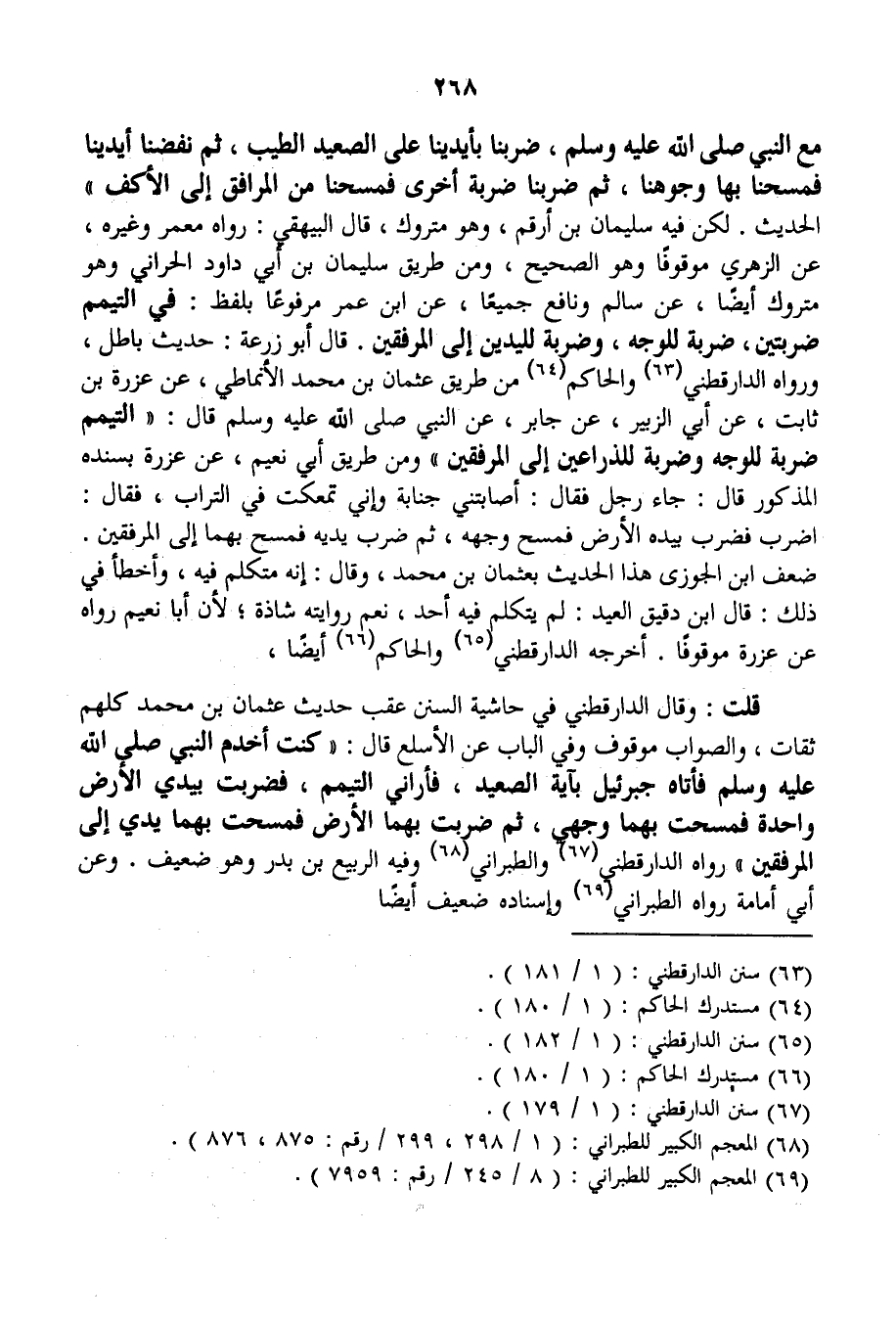 قُلْت: وَقَالَ الدَّارَقُطْنِيُّ فِي حَاشِيَةِ السُّنَنِ عَقِبَ حَدِيثِ عُثْمَانَ بْنِ مُحَمَّدٍ كُلُّهُمْ ثِقَاتٌ، وَالصَّوَابُ مَوْقُوفٌ وَفِي الْبَابِ عَنْ الْأَسْلَعِ قَالَ: «كُنْت أَخْدُمُ النَّبِيَّ - صَلَّى اللَّهُ عَلَيْهِ وَسَلَّمَ - فَأَتَاهُ جَبْرَائِيلُ بِآيَةِ الصَّعِيدِ، فَأَرَانِي التَّيَمُّمَ، فَضَرَبْت بِيَدَيَّ الْأَرْضَ وَاحِدَةً فَمَسَحْتُ بِهِمَا وَجْهِي، ثُمَّ ضَرَبْتُ بِهِمَا الْأَرْضَ فَمَسَحْتُ بِهِمَا يَدَيَّ إلَى الْمِرْفَقَيْنِ» رَوَاهُ الدَّارَقُطْنِيُّ وَالطَّبَرَانِيُّ وَفِيهِ الرَّبِيعُ بْنُ بَدْرٍ وَهُوَ ضَعِيفٌ. وَعَنْ أَبِي أُمَامَةَ رَوَاهُ الطَّبَرَانِيُّ وَإِسْنَادُهُ ضَعِيفٌ أَيْضًا