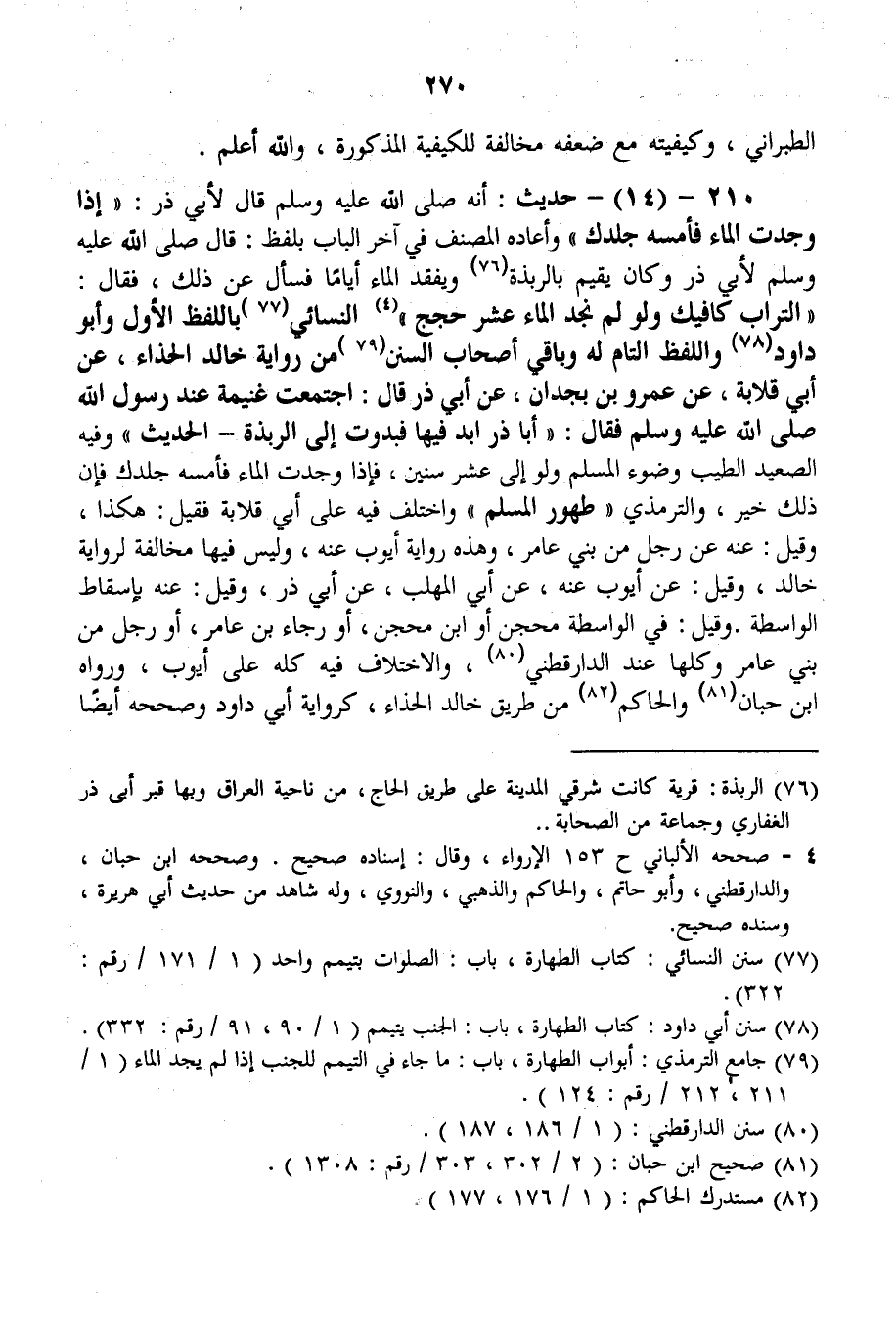 210 - (14) - حَدِيثُ: «أَنَّهُ - صَلَّى اللَّهُ عَلَيْهِ وَسَلَّمَ - قَالَ لِأَبِي ذَرٍّ: إذَا وَجَدْتَ الْمَاءَ فَأَمِسَّهُ جِلْدَكَ» وَأَعَادَهُ الْمُصَنِّفُ فِي آخِرِ الْبَابِ بِلَفْظِ: «قَالَ - صَلَّى اللَّهُ عَلَيْهِ وَسَلَّمَ - لِأَبِي ذَرٍّ وَكَانَ يُقِيمُ بِالرَّبَذَةِ وَيَفْقِدُ الْمَاءَ أَيَّامًا فَسَأَلَ عَنْ ذَلِكَ، فَقَالَ: التُّرَابُ كَافِيكَ وَلَوْ لَمْ نَجِدْ الْمَاءَ عَشْرَ حِجَجٍ» النَّسَائِيُّ بِاللَّفْظِ الْأَوَّلِ وَأَبُو دَاوُد وَاللَّفْظُ التَّامُّ لَهُ وَبَاقِي أَصْحَابِ السُّنَنِ مِنْ رِوَايَةِ خَالِدٍ الْحَذَّاءِ، عَنْ أَبِي قِلَابَةَ، عَنْ عَمْرِو بْنِ بَجْدَانَ، عَنْ أَبِي ذَرٍّ قَالَ: «اجْتَمَعَتْ غَنِيمَةٌ عِنْدَ رَسُولِ اللَّهِ - صَلَّى اللَّهُ عَلَيْهِ وَسَلَّمَ - فَقَالَ: أَبَا ذَرٍّ اُبْدُ فِيهَا فَبَدَوْتُ إلَى الرَّبَذَةِ -» الْحَدِيثَ " وَفِيهِ «الصَّعِيدُ الطَّيِّبُ وَضُوءُ الْمُسْلِمِ وَلَوْ إلَى عَشْرِ سِنِينَ، فَإِذَا وَجَدْت الْمَاءَ فَأَمِسَّهُ جِلْدَكَ فَإِنَّ ذَلِكَ خَيْرٌ» ، وَالتِّرْمِذِيُّ «طَهُورُ الْمُسْلِمِ» وَاخْتُلِفَ فِيهِ عَلَى أَبِي قِلَابَةَ فَقِيلَ: هَكَذَا، وَقِيلَ: عَنْهُ عَنْ رَجُلٍ مِنْ بَنِي عَامِرٍ، وَهَذِهِ رِوَايَةُ أَيُّوبَ عَنْهُ، وَلَيْسَ فِيهَا مُخَالَفَةٌ لِرِوَايَةِ خَالِدٍ، وَقِيلَ: عَنْ أَيُّوبَ عَنْهُ، عَنْ أَبِي الْمُهَلَّبِ، عَنْ أَبِي ذَرٍّ، وَقِيلَ: عَنْهُ بِإِسْقَاطِ الْوَاسِطَةِ.