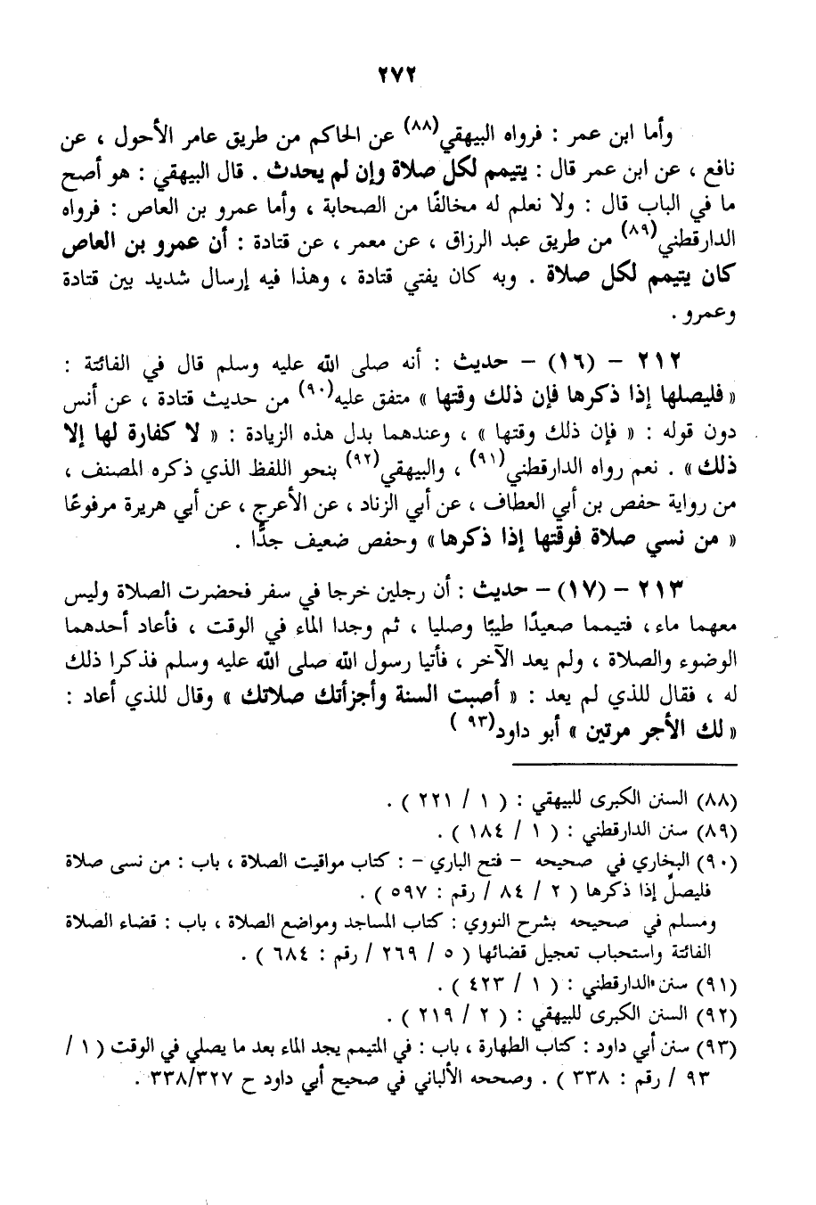 212 - (16) - حَدِيثُ: «أَنَّهُ - صَلَّى اللَّهُ عَلَيْهِ وَسَلَّمَ - قَالَ فِي الْفَائِتَةِ: فَلْيُصَلِّهَا إذَا ذَكَرَهَا فَإِنَّ ذَلِكَ وَقْتُهَا» مُتَّفَقٌ عَلَيْهِ مِنْ حَدِيثِ قَتَادَةَ، عَنْ أَنَسٍ دُونَ قَوْلِهِ: «فَإِنَّ ذَلِكَ وَقْتُهَا» ، وَعِنْدَهُمَا بَدَلَ هَذِهِ الزِّيَادَةَ: «لَا كَفَّارَةَ لَهَا إلَّا ذَلِكَ» . نَعَمْ رَوَاهُ الدَّارَقُطْنِيُّ، وَالْبَيْهَقِيُّ بِنَحْوِ اللَّفْظِ الَّذِي ذَكَرَهُ الْمُصَنِّفُ، مِنْ رِوَايَةِ حَفْصِ بْنِ أَبِي الْعَطَّافِ، عَنْ أَبِي الزِّنَادِ، عَنْ الْأَعْرَجِ، عَنْ أَبِي هُرَيْرَةَ مَرْفُوعًا «مَنْ نَسِيَ صَلَاةً فَوَقْتُهَا إذَا ذَكَرَهَا» وَحَفْصٌ ضَعِيفٌ جِدًّا.