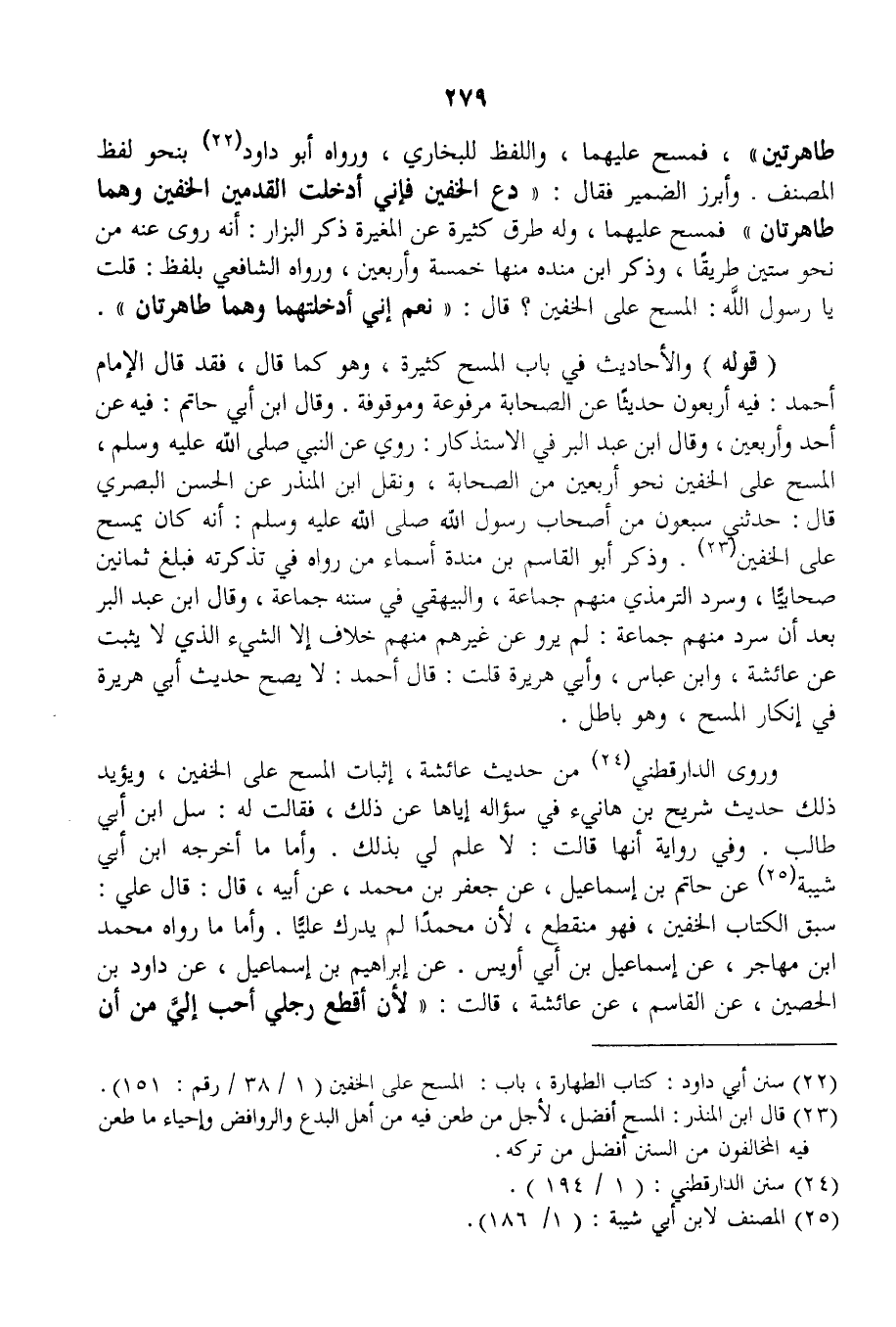طَاهِرَتَيْنِ» ، فَمَسَحَ عَلَيْهِمَا، وَاللَّفْظُ لِلْبُخَارِيِّ، وَرَوَاهُ أَبُو دَاوُد بِنَحْوِ لَفْظِ الْمُصَنِّفِ وَأَبْرَزَ الضَّمِيرَ فَقَالَ: «دَعْ الْخُفَّيْنِ فَإِنِّي أَدْخَلْتُ الْقَدَمَيْنِ الْخُفَّيْنِ وَهُمَا طَاهِرَتَانِ» فَمَسَحَ عَلَيْهِمَا، وَلَهُ طُرُقٌ كَثِيرَةٌ عَنْ الْمُغِيرَةِ، ذَكَرَ الْبَزَّارُ: أَنَّهُ رُوِيَ عَنْهُ مِنْ نَحْوِ سِتِّينَ طَرِيقًا، وَذَكَرَ ابْنُ مَنْدَهْ مِنْهَا خَمْسَةً وَأَرْبَعِينَ، وَرَوَاهُ الشَّافِعِيُّ بِلَفْظِ: «قُلْتُ يَا رَسُولَ اللَّهِ: الْمَسْحُ عَلَى الْخُفَّيْنِ؟ قَالَ: نَعَمْ إنِّي أَدْخَلْتُهُمَا وَهُمَا طَاهِرَتَانِ» .