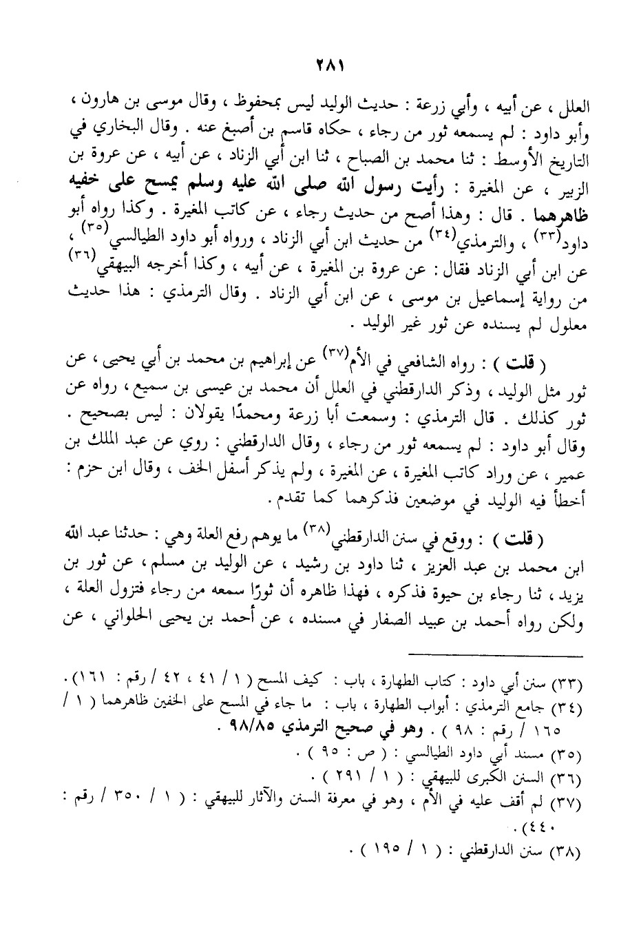 (قُلْت) : رَوَاهُ الشَّافِعِيُّ فِي الْأُمِّ عَنْ إبْرَاهِيمَ بْنِ مُحَمَّدِ بْنِ أَبِي يَحْيَى، عَنْ ثَوْرٍ مُمْلِ الْوَلِيدَ، وَذَكَرَ الدَّارَقُطْنِيُّ فِي الْعِلَلِ أَنَّ مُحَمَّدَ بْنَ عِيسَى بْنِ سُمَيْعٍ، رَوَاهُ عَنْ ثَوْرٍ كَذَلِكَ. قَالَ التِّرْمِذِيُّ: وَسَمِعْتُ أَبَا زُرْعَةَ وَمُحَمَّدًا يَقُولَانِ: لَيْسَ بِصَحِيحٍ. وَقَالَ أَبُو دَاوُد: لَمْ يَسْمَعْهُ ثَوْرٌ مِنْ رَجَاءٍ، وَقَالَ الدَّارَقُطْنِيُّ: رُوِيَ عَنْ عَبْدِ الْمَلِكِ بْنِ عُمَيْرٍ، عَنْ وَرَّادٍ كَاتِبِ الْمُغِيرَةِ، عَنْ الْمُغِيرَةِ، وَلَمْ يَذْكُرْ أَسْفَلَ الْخُفِّ، وَقَالَ ابْنُ حَزْمٍ: أَخْطَأَ فِيهِ الْوَلِيدُ فِي مَوْضِعَيْنِ فَذَكَرَهُمَا كَمَا تَقَدَّمَ.