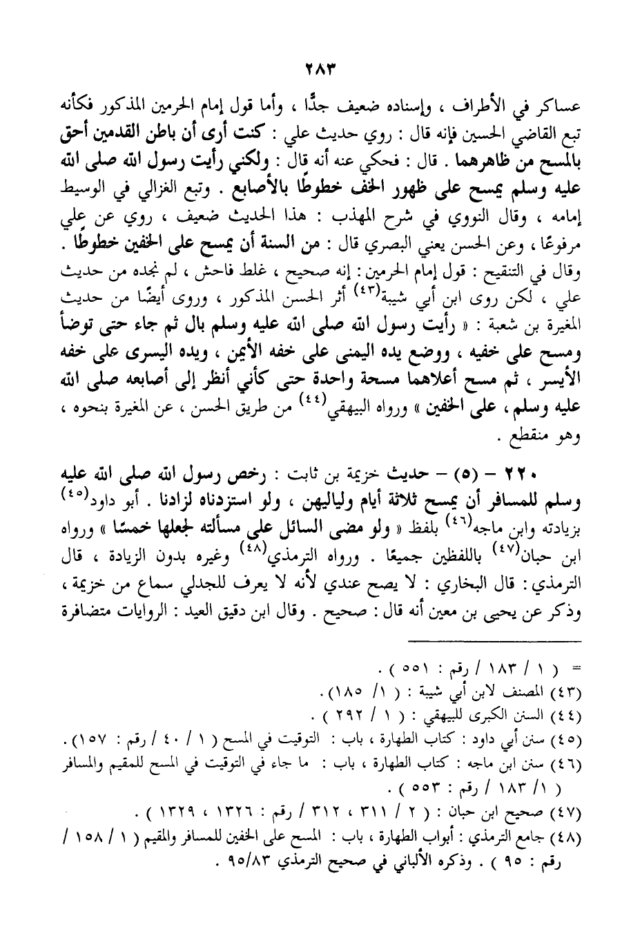 220 - (5) - حَدِيثُ خُزَيْمَةَ بْنِ ثَابِتٍ: «رَخَّصَ رَسُولُ اللَّهِ - صَلَّى اللَّهُ عَلَيْهِ وَسَلَّمَ - لِلْمُسَافِرِ أَنْ يَمْسَحَ ثَلَاثَةَ أَيَّامٍ وَلَيَالِيهِنَّ، وَلَوْ اسْتَزَدْنَاهُ لَزَادَنَا.» أَبُو دَاوُد بِزِيَادَتِهِ وَابْنُ مَاجَهْ بِلَفْظِ «وَلَوْ مَضَى السَّائِلُ عَلَى مَسْأَلَتِهِ لَجَعَلَهَا خَمْسًا» وَرَوَاهُ ابْنُ حِبَّانَ بِاللَّفْظَيْنِ جَمِيعًا. وَرَوَاهُ التِّرْمِذِيُّ وَغَيْرُهُ بِدُونِ الزِّيَادَةِ، قَالَ التِّرْمِذِيُّ: قَالَ الْبُخَارِيُّ: لَا يَصِحُّ عِنْدِي لِأَنَّهُ لَا يُعْرَفُ لِلْجَدَلِيِّ سَمَاعٌ مِنْ خُزَيْمَةَ، وَذَكَرَ عَنْ يَحْيَى بْنِ مَعِينٍ أَنَّهُ قَالَ: صَحِيحٌ. وَقَالَ ابْنُ دَقِيقِ الْعِيدِ: الرِّوَايَاتُ مُتَضَافِرَةٌ