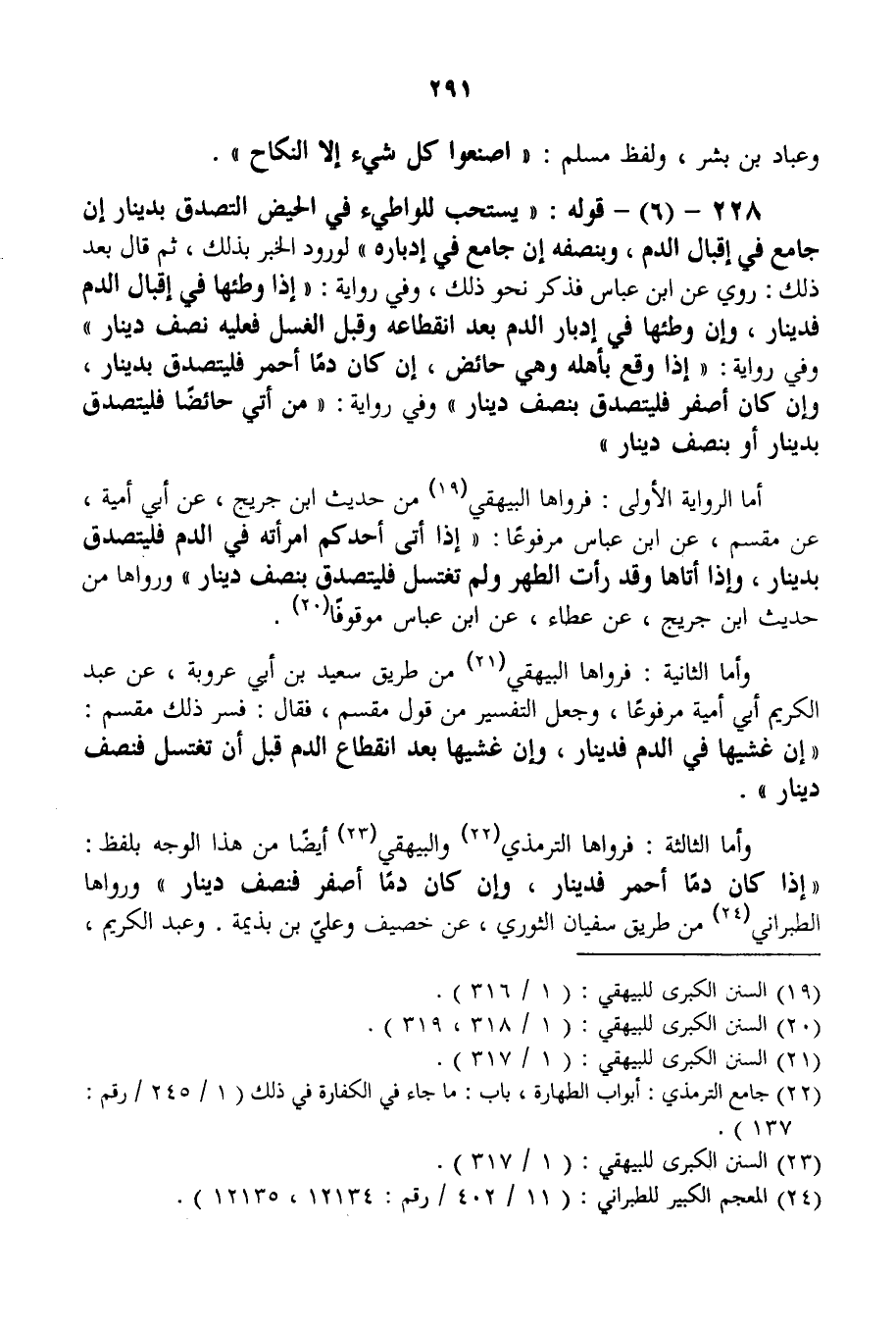 228 - (6) - قَوْلُهُ: «يُسْتَحَبُّ لِلْوَاطِئِ فِي الْحَيْضِ التَّصَدُّقُ بِدِينَارٍ إنْ جَامَعَ فِي إقْبَالِ الدَّمِ، وَبِنِصْفِهِ إنْ جَامَعَ فِي إدْبَارِهِ» ؛ لِوُرُودِ الْخَبَرِ بِذَلِكَ، ثُمَّ قَالَ بَعْدَ ذَلِكَ: رُوِيَ عَنْ ابْنِ عَبَّاسٍ فَذَكَرَ نَحْوَ ذَلِكَ، وَفِي رِوَايَةٍ: «إذَا وَطِئَهَا فِي إقْبَالِ الدَّمِ فَدِينَارٌ، وَإِنْ وَطِئَهَا فِي إدْبَارِ الدَّمِ بَعْدَ انْقِطَاعِهِ وَقَبْلَ الْغُسْلِ فَعَلَيْهِ نِصْفُ دِينَارٍ» وَفِي رِوَايَةٍ: «إذَا وَقَعَ بِأَهْلِهِ وَهِيَ حَائِضٌ، إنْ كَانَ دَمًا أَحْمَرَ فَلْيَتَصَدَّقْ بِدِينَارٍ، وَإِنْ كَانَ أَصْفَرَ فَلْيَتَصَدَّقْ بِنِصْفِ دِينَارٍ» وَفِي رِوَايَةٍ: «مَنْ أَتَى حَائِضًا فَلْيَتَصَدَّقْ بِدِينَارٍ أَوْ بِنِصْفِ دِينَارٍ» أَمَّا الرِّوَايَةُ الْأُولَى: فَرَوَاهَا الْبَيْهَقِيُّ مِنْ حَدِيثِ ابْنِ جُرَيْجٍ، عَنْ أَبِي أُمَيَّةَ، عَنْ مِقْسَمٍ، عَنْ ابْنِ عَبَّاسٍ مَرْفُوعًا: «إذَا أَتَى أَحَدُكُمْ امْرَأَتَهُ فِي الدَّمِ فَلْيَتَصَدَّقْ بِدِينَارٍ؛ وَإِذَا أَتَاهَا وَقَدْ رَأَتْ الطُّهْرَ وَلَمْ تَغْتَسِلْ فَلْيَتَصَدَّقْ بِنِصْفِ دِينَارٍ» وَرَوَاهَا مِنْ حَدِيثِ ابْنِ جُرَيْجٍ، عَنْ عَطَاءٍ، عَنْ ابْنِ عَبَّاسٍ مَوْقُوفًا.