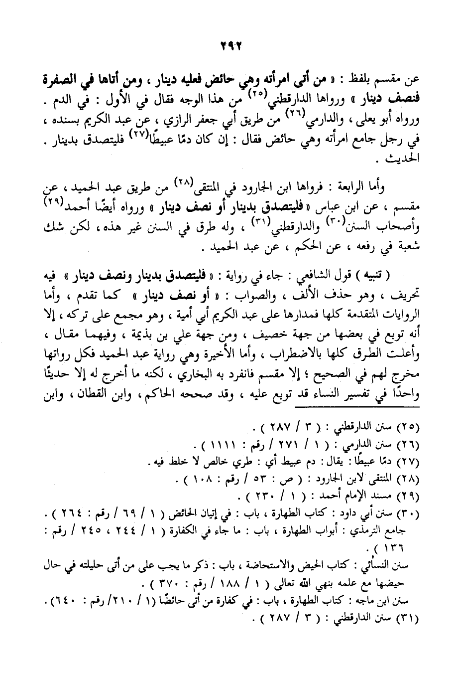 عَنْ مِقْسَمٍ بِلَفْظِ: «مَنْ أَتَى امْرَأَتَهُ وَهِيَ حَائِضٌ فَعَلَيْهِ دِينَارٌ، وَمَنْ أَتَاهَا فِي الصُّفْرَةِ فَنِصْفُ دِينَارٍ» وَرَوَاهَا الدَّارَقُطْنِيُّ مِنْ هَذَا الْوَجْهِ فَقَالَ فِي الْأَوَّلِ: فِي الدَّمِ. وَرَوَاهُ أَبُو يَعْلَى، وَالدَّارِمِيُّ مِنْ طَرِيقِ أَبِي جَعْفَرٍ الرَّازِيِّ، عَنْ عَبْدِ الْكَرِيمِ بِسَنَدِهِ، فِي «رَجُلٍ جَامَعَ امْرَأَتَهُ وَهِيَ حَائِضٌ فَقَالَ: إنْ كَانَ دَمًا عَبِيطًا فَلْيَتَصَدَّقْ بِدِينَارٍ» الْحَدِيثَ. وَأَمَّا الرَّابِعَةُ: فَرَوَاهَا ابْنُ الْجَارُودِ فِي الْمُنْتَقَى مِنْ طَرِيقِ عَبْدِ الْحَمِيدِ، عَنْ مِقْسَمٍ، عَنْ ابْنِ عَبَّاسٍ «فَلْيَتَصَدَّقْ بِدِينَارٍ أَوْ نِصْفِ دِينَارٍ» وَرَوَاهُ أَيْضًا أَحْمَدُ وَأَصْحَابُ السُّنَنِ وَالدّارَقُطْنِيُّ، وَلَهُ طُرُقٌ فِي السُّنَنِ غَيْرُ هَذِهِ، لَكِنْ شَكَّ شُعْبَةُ فِي رَفْعِهِ، عَنْ الْحَكَمِ، عَنْ عَبْدِ الْحَمِيدِ.