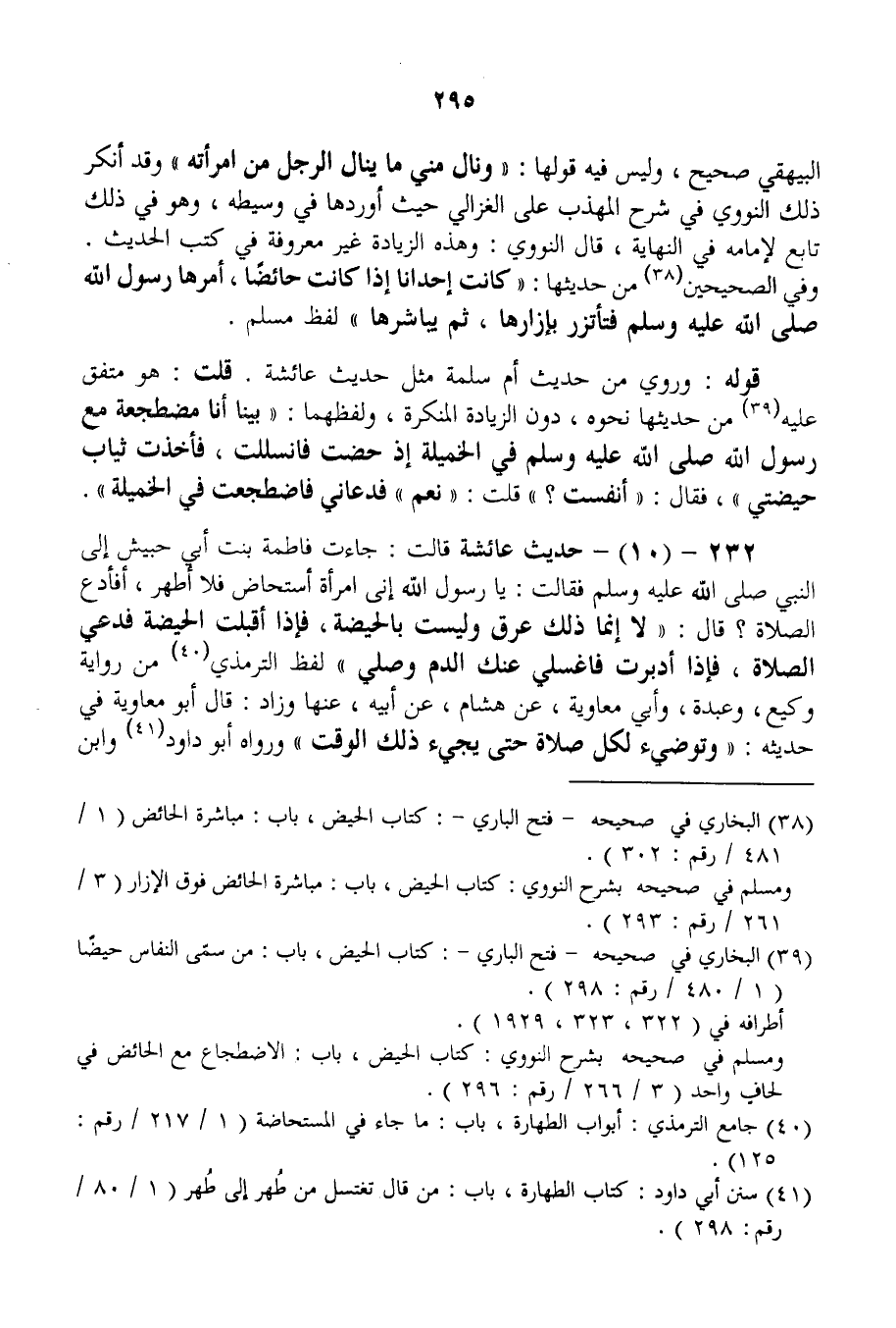 232 - (10) - حَدِيثُ عَائِشَةَ قَالَتْ: «جَاءَتْ فَاطِمَةُ بِنْتُ أَبِي حُبَيْشٍ إلَى النَّبِيِّ - صَلَّى اللَّهُ عَلَيْهِ وَسَلَّمَ - فَقَالَتْ: يَا رَسُولَ اللَّهِ إنِّي امْرَأَةٌ أُسْتَحَاضُ فَلَا أَطْهُرُ، أَفَأَدَعُ الصَّلَاةَ؟ قَالَ: لَا إنَّمَا ذَلِكَ عِرْقٌ وَلَيْسَتْ بِالْحَيْضَةِ، فَإِذَا أَقْبَلَتْ الْحَيْضَةُ فَدَعِي الصَّلَاةَ، فَإِذَا أَدْبَرَتْ فَاغْسِلِي عَنْك الدَّمَ وَصَلِّي» لَفْظُ التِّرْمِذِيِّ مِنْ رِوَايَةِ وَكِيعٍ، وَعَبْدَةَ، وَأَبِي مُعَاوِيَةَ، عَنْ هِشَامٍ، عَنْ أَبِيهِ، عَنْهَا وَزَادَ: قَالَ أَبُو مُعَاوِيَةَ فِي حَدِيثِهِ: «وَتَوَضَّئِي لِكُلِّ صَلَاةٍ حَتَّى يَجِيءَ ذَلِكَ الْوَقْتُ» وَرَوَاهُ أَبُو دَاوُد وَابْنُ مَاجَهْ