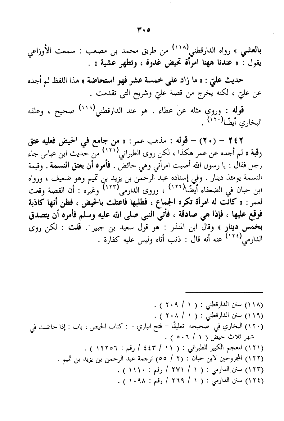 242 - (20) - قَوْلُهُ: مَذْهَبُ عُمَرَ: مَنْ جَامَعَ فِي الْحَيْضِ فَعَلَيْهِ عِتْقُ رَقَبَةٍ " لَمْ أَجِدْهُ عَنْ عُمَرَ هَكَذَا، لَكِنْ رَوَى الطَّبَرَانِيُّ مِنْ حَدِيثِ ابْنِ عَبَّاسٍ «جَاءَ رَجُلٌ فَقَالَ: يَا رَسُولَ اللَّهِ أَصَبْت امْرَأَتِي وَهِيَ حَائِضٌ. فَأَمَرَهُ أَنْ يُعْتِقَ النَّسَمَةَ وَقِيمَةُ النَّسَمَةِ يَوْمَئِذٍ دِينَارٌ» . وَفِي إسْنَادِهِ عَبْدُ الرَّحْمَنِ بْنُ يَزِيدَ بْنِ تَمِيمٍ وَهُوَ ضَعِيفٌ، وَرَوَاهُ ابْنُ حِبَّانَ فِي الضُّعَفَاءِ أَيْضًا.