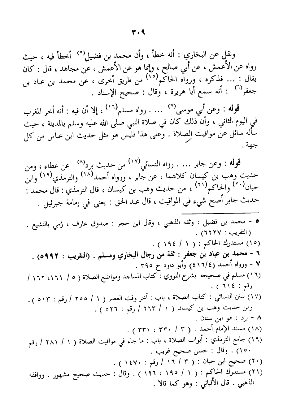 وَنُقِلَ عَنْ الْبُخَارِيِّ: أَنَّهُ خَطَأٌ، وَأَنَّ مُحَمَّدَ بْنَ فُضَيْلٍ أَخْطَأَ فِيهِ، حَيْثُ رَوَاهُ عَنْ الْأَعْمَشِ، عَنْ أَبِي صَالِحٍ، وَإِنَّمَا هُوَ عَنْ الْأَعْمَشِ، عَنْ مُجَاهِدٍ، قَالَ: كَانَ يُقَالُ: فَذَكَرَهُ، وَرَوَاهُ الْحَاكِمُ مِنْ طَرِيقٍ أُخْرَى، عَنْ مُحَمَّدِ بْنِ عَبَّادٍ بْنِ جَعْفَرٍ: أَنَّهُ سَمِعَ أَبَا هُرَيْرَةَ، وَقَالَ: صَحِيحُ الْإِسْنَادِ. قَوْلُهُ: وَعَنْ أَبِي مُوسَى. . . رَوَاهُ مُسْلِمٌ، إلَّا أَنَّ فِيهِ: أَنَّهُ أَخَّرَ الْمَغْرِبَ فِي الْيَوْمِ الثَّانِي، وَأَنَّ ذَلِكَ كَانَ فِي صَلَاةِ النَّبِيِّ - صَلَّى اللَّهُ عَلَيْهِ وَسَلَّمَ - بِالْمَدِينَةِ، حَيْثُ سَأَلَهُ سَائِلٌ عَنْ مَوَاقِيتِ الصَّلَاةِ. وَعَلَى هَذَا فَلَيْسَ هُوَ مِثْلَ حَدِيثِ ابْنِ عَبَّاسٍ مِنْ كُلِّ جِهَةٍ.