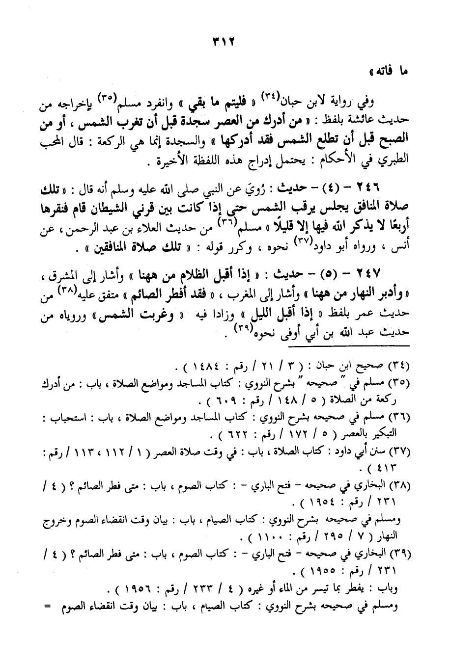 246 - (4) - حَدِيثٌ: «رُوِيَ عَنْ النَّبِيِّ - صَلَّى اللَّهُ عَلَيْهِ وَسَلَّمَ - أَنَّهُ قَالَ: تِلْكَ صَلَاةُ الْمُنَافِقِ يَجْلِسُ يَرْقُبُ الشَّمْسَ حَتَّى إذَا كَانَتْ بَيْنَ قَرْنَيْ الشَّيْطَانِ قَامَ فَنَقَرَهَا أَرْبَعًا لَا يَذْكُرُ اللَّهَ فِيهَا إلَّا قَلِيلًا» مُسْلِمٌ مِنْ حَدِيثِ الْعَلَاءِ بْنِ عَبْدِ الرَّحْمَنِ، عَنْ أَنَسٍ، وَرَوَاهُ أَبُو دَاوُد نَحْوَهُ، وَكَرَّرَ قَوْلَهُ: «تِلْكَ صَلَاةُ الْمُنَافِقِينَ» .