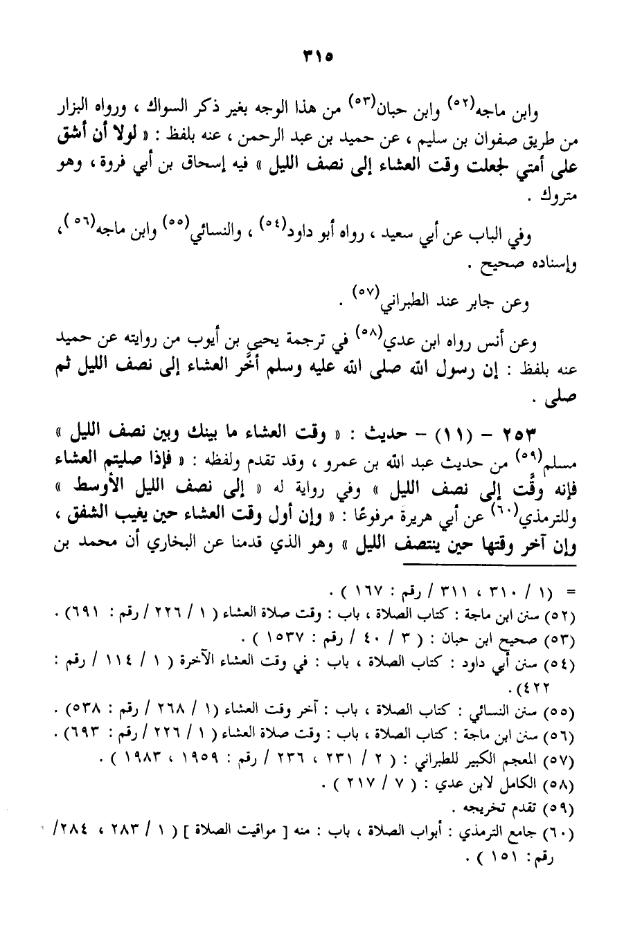 253 - (11) - حَدِيثٌ: «وَقْتُ الْعِشَاءِ مَا بَيْنَك وَبَيْنَ نِصْفِ اللَّيْلِ» مُسْلِمٌ مِنْ حَدِيثِ عَبْدِ اللَّهِ بْنِ عَمْرٍو، وَقَدْ تَقَدَّمَ وَلَفْظُهُ: «فَإِذَا صَلَّيْتُمْ الْعِشَاءَ فَإِنَّهُ وَقْتٌ إلَى نِصْفِ اللَّيْلِ» وَفِي رِوَايَةٍ لَهُ «إلَى نِصْفِ اللَّيْلِ الْأَوْسَطِ» وَلِلتِّرْمِذِيِّ عَنْ أَبِي هُرَيْرَةَ مَرْفُوعًا: «وَإِنَّ أَوَّلَ وَقْتِ الْعِشَاءِ حِينَ يَغِيبُ الشَّفَقُ، وَإِنَّ آخِرَ وَقْتِهَا حِينَ يَنْتَصِفُ اللَّيْلُ» وَهُوَ الَّذِي قَدَّمْنَا عَنْ الْبُخَارِيِّ أَنَّ مُحَمَّدَ بْنَ فُضَيْلٍ
